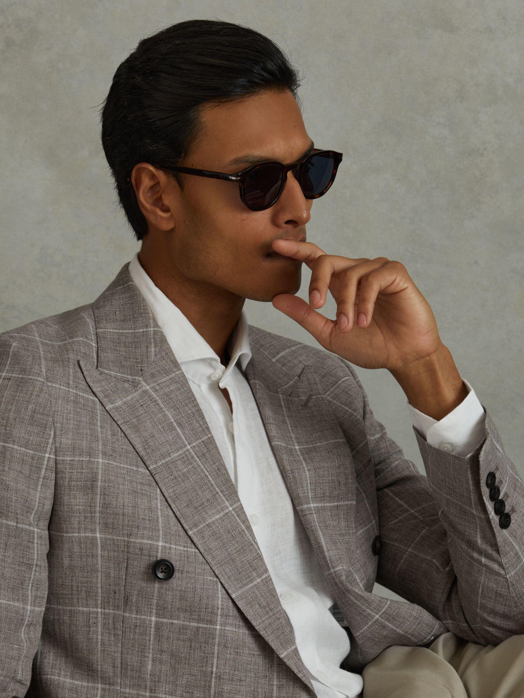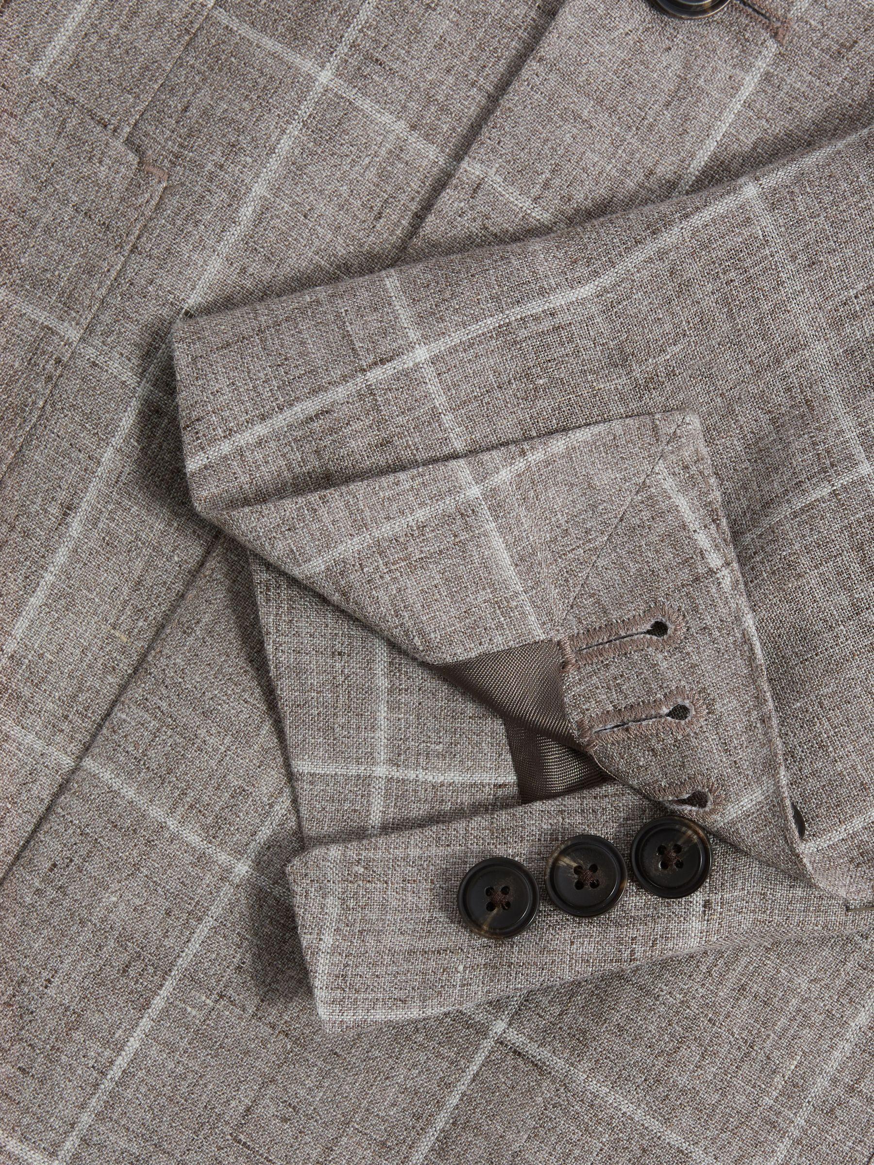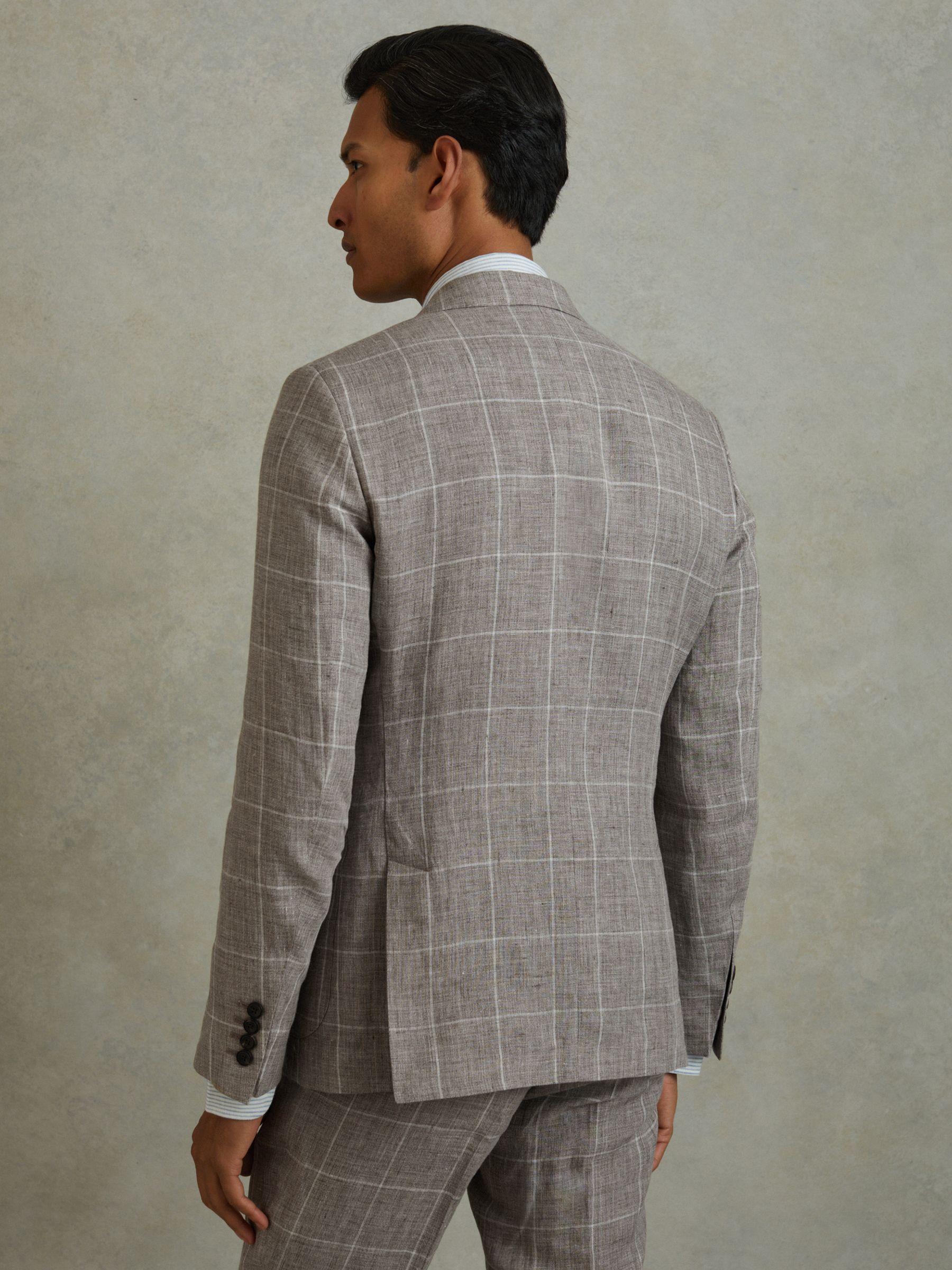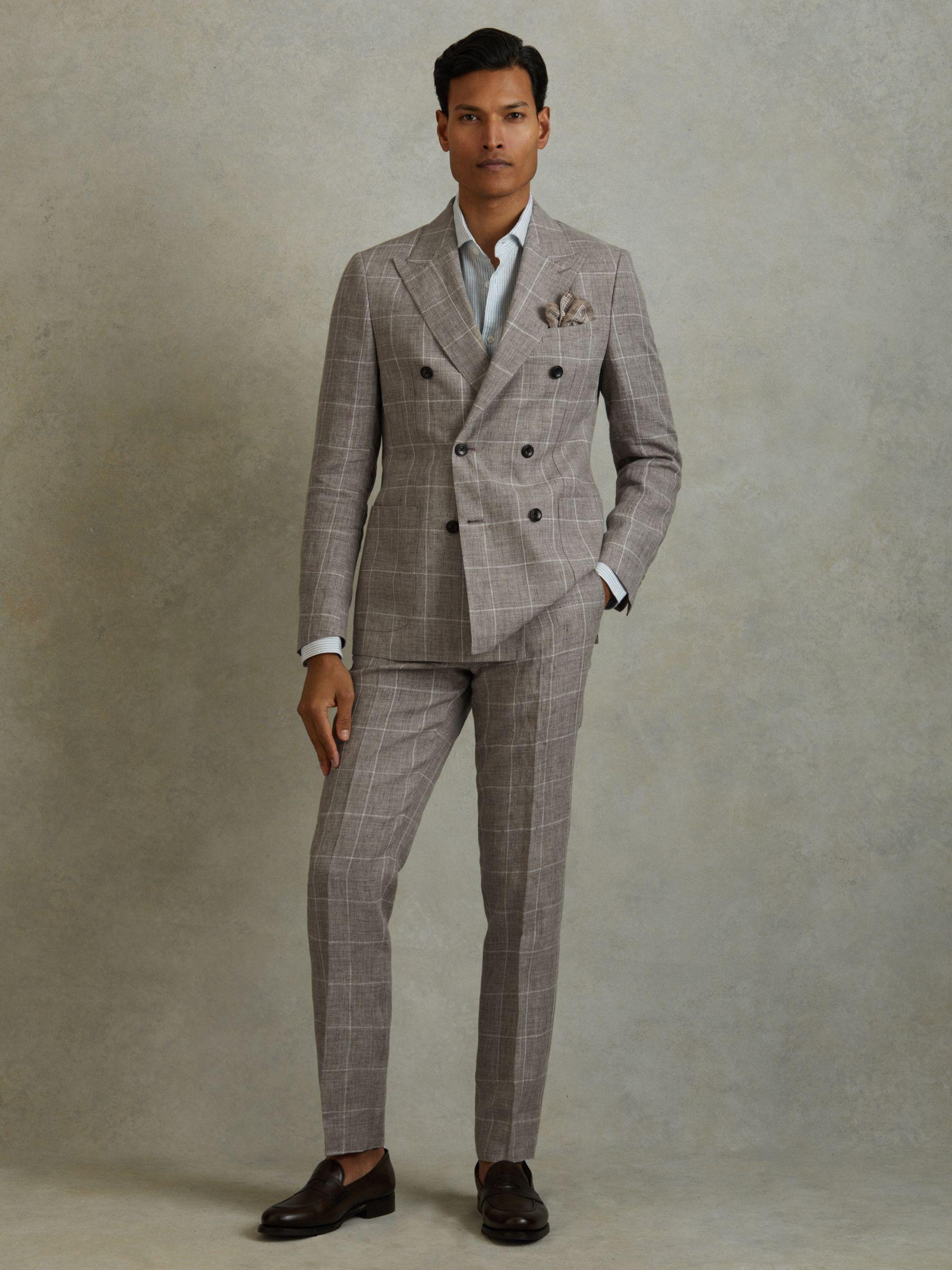 The Burgess double-breasted blazer is made from linen for a natural woven feel. It’s iterated in a checked design with a slub finish and mottled buttons. Matching trousers. 100% linen. Checked Slub finish. Double breasted. Buggy lining. Dual vent to reverse.
