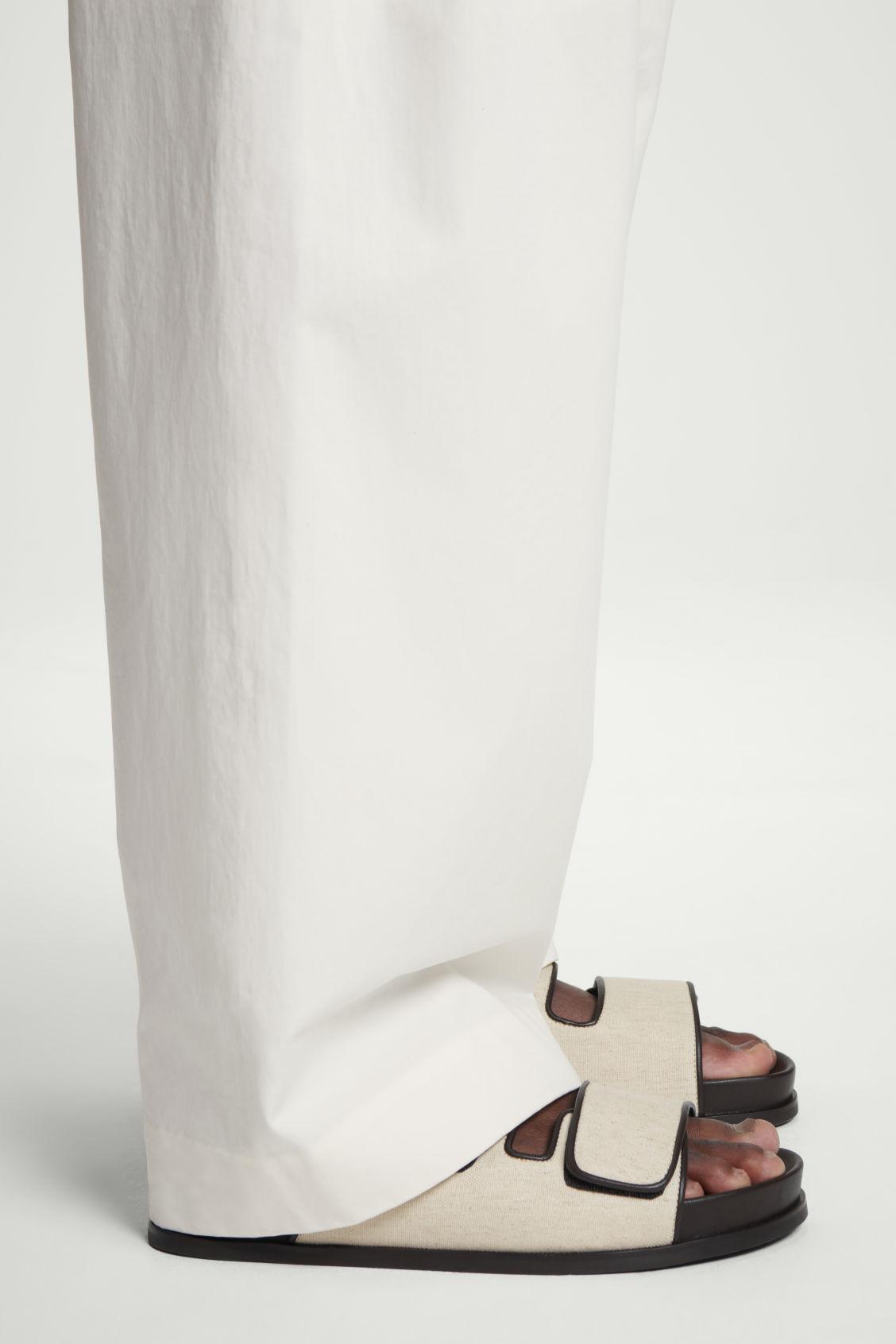 Linen takes on a new guise for Spring Summer 2025. These refined sandals are trimmed with premium leather and feature wide double straps and durable rubber soles. Style them with wide-leg pants for weekends in the city. Hook-and-loop closureCOS supports responsible manufacturing via the Leather Working Group Upper: 100% Linen. Sock and lining: 100% Leather. Sole: 100% Thermoplastic rubber. Excluding trims