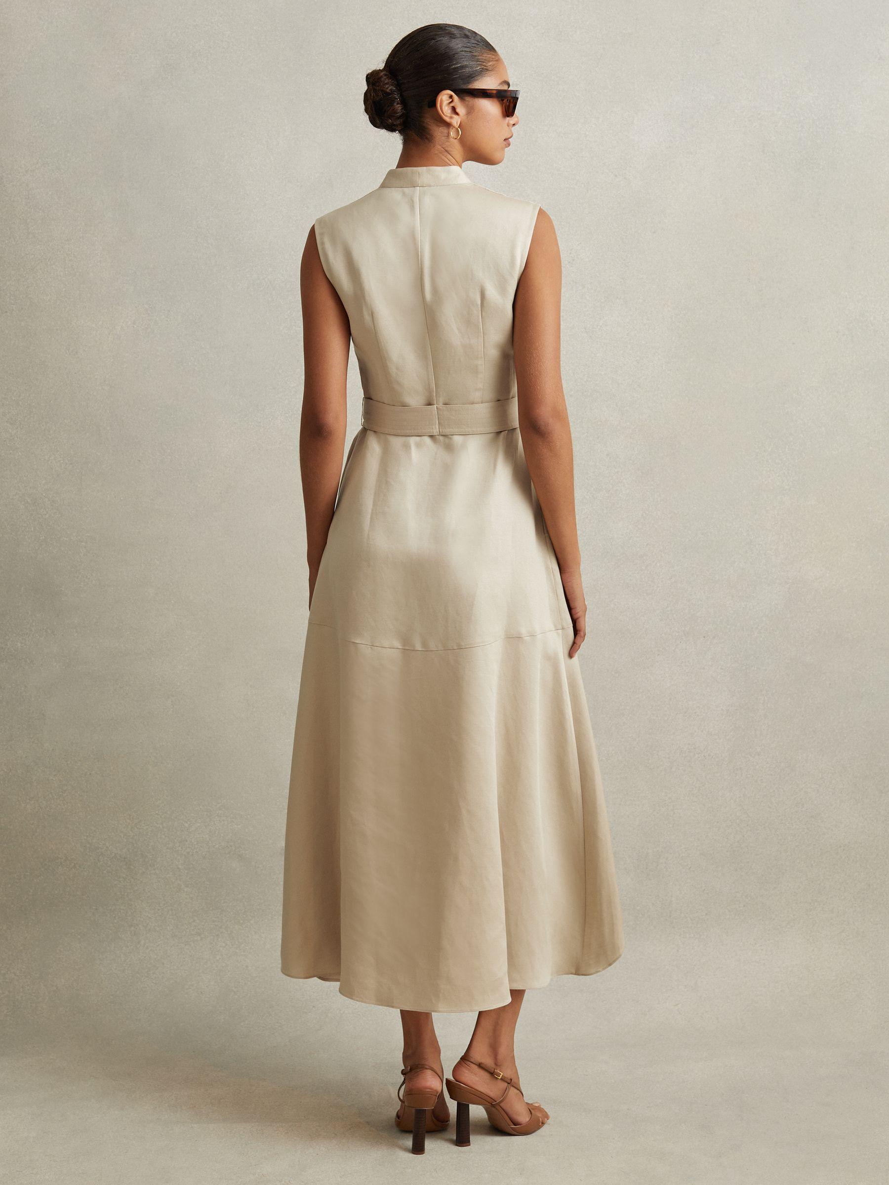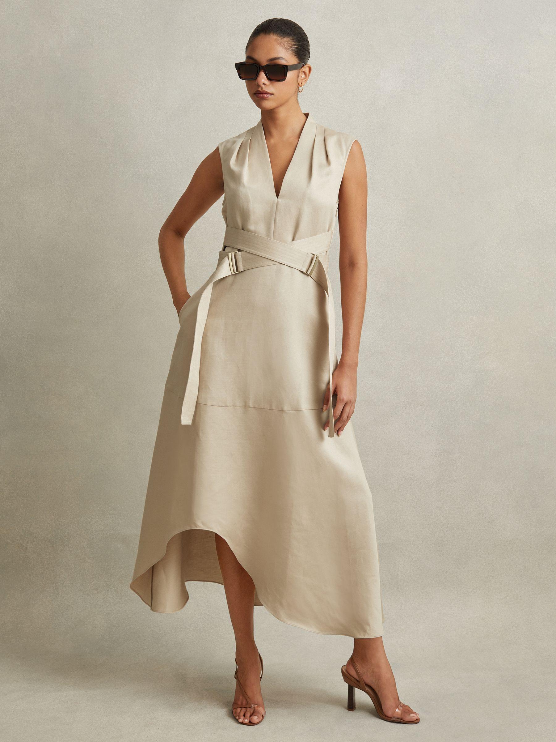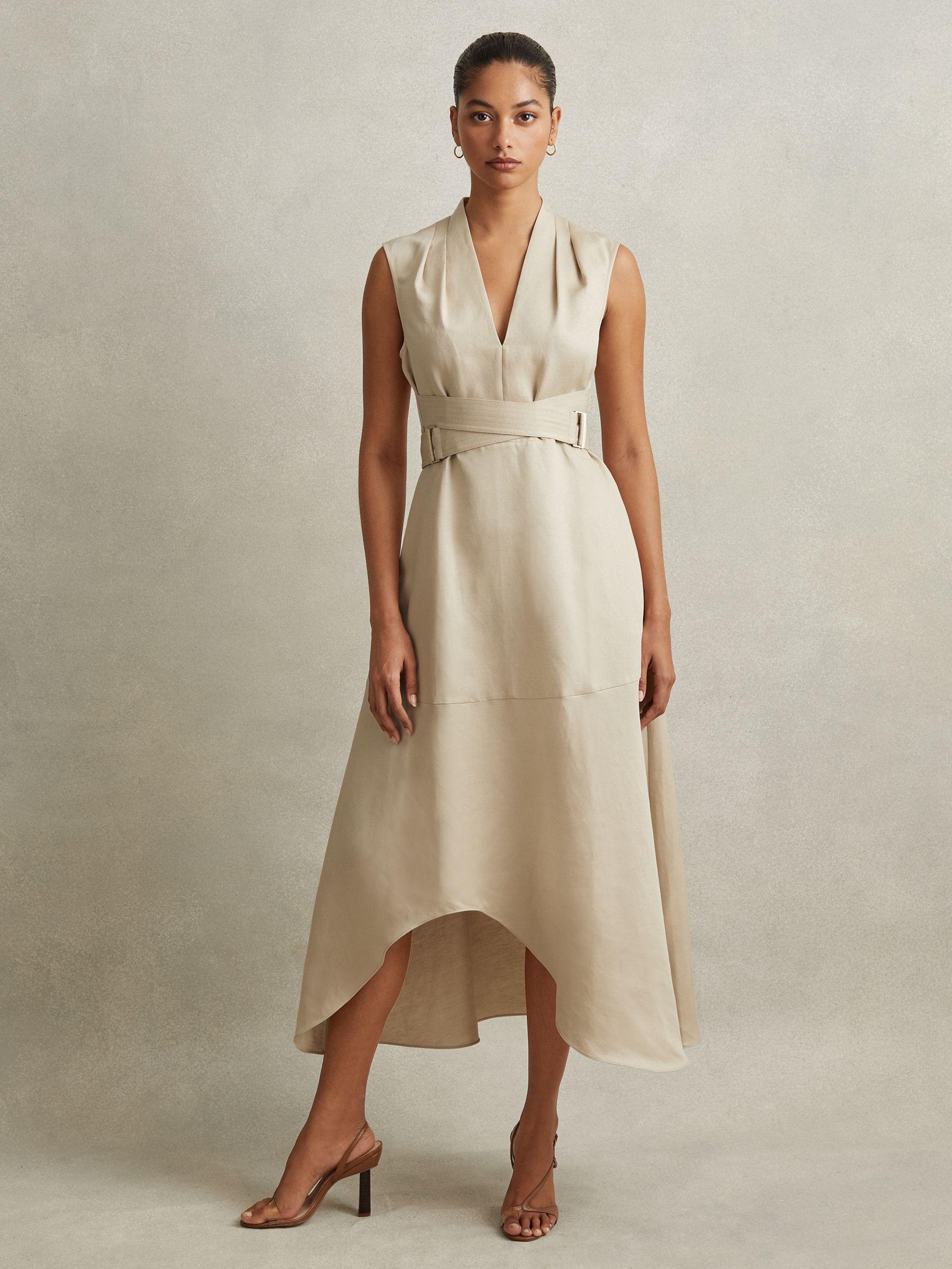Inspired by a corsetry aesthetic, the Ava midi dress cinches at the waist with adjustable belt straps. It's lustrous linen-lyocell fabric and tactful shoulder pleats maintain a confident look. Linen-lyocell blend. V-Neckline. Pleats to shoulder. Adjustable belt straps. Side pockets. Zip-closure to side. Dipped midi length. The model is wearing a size 8.