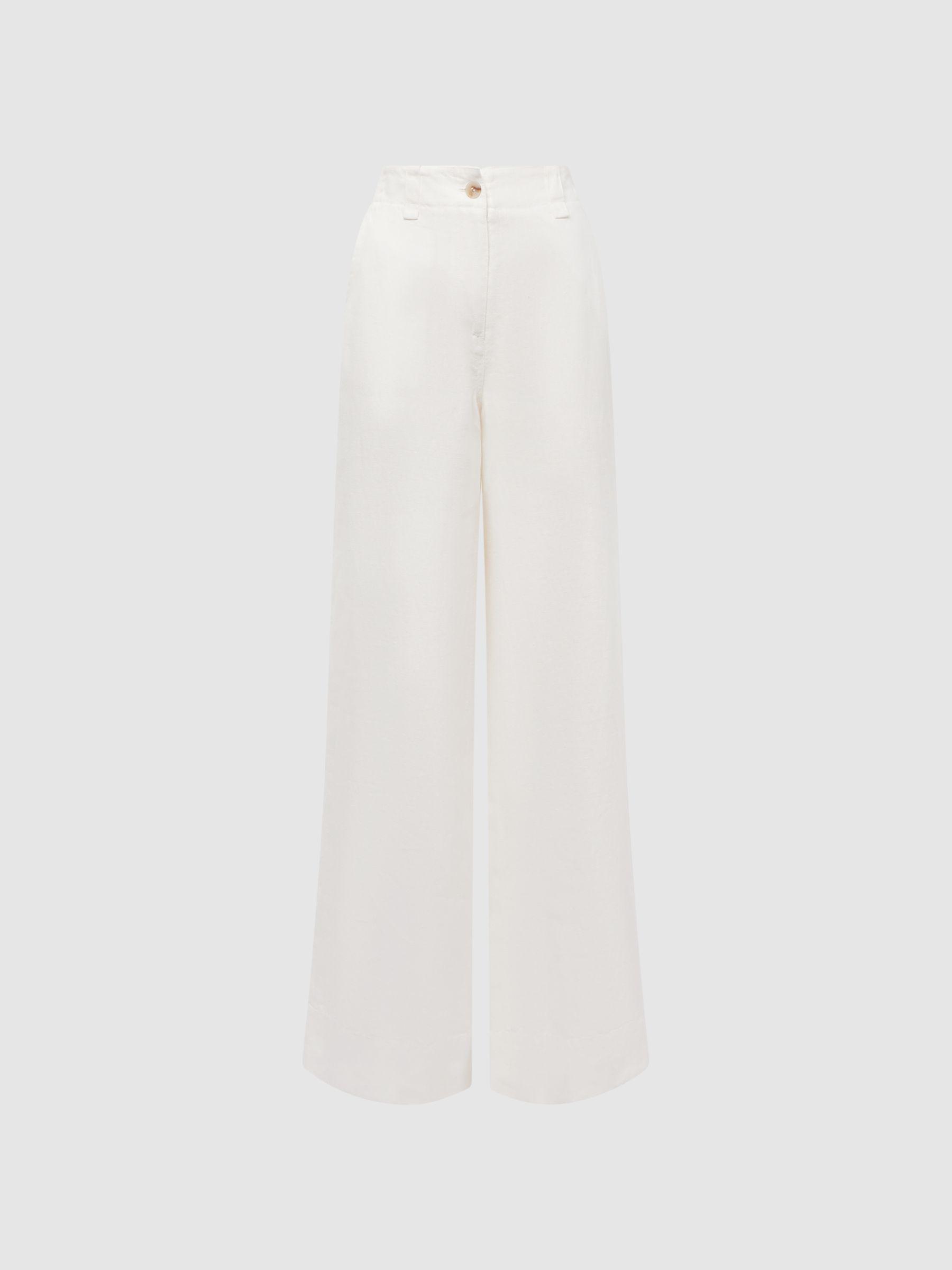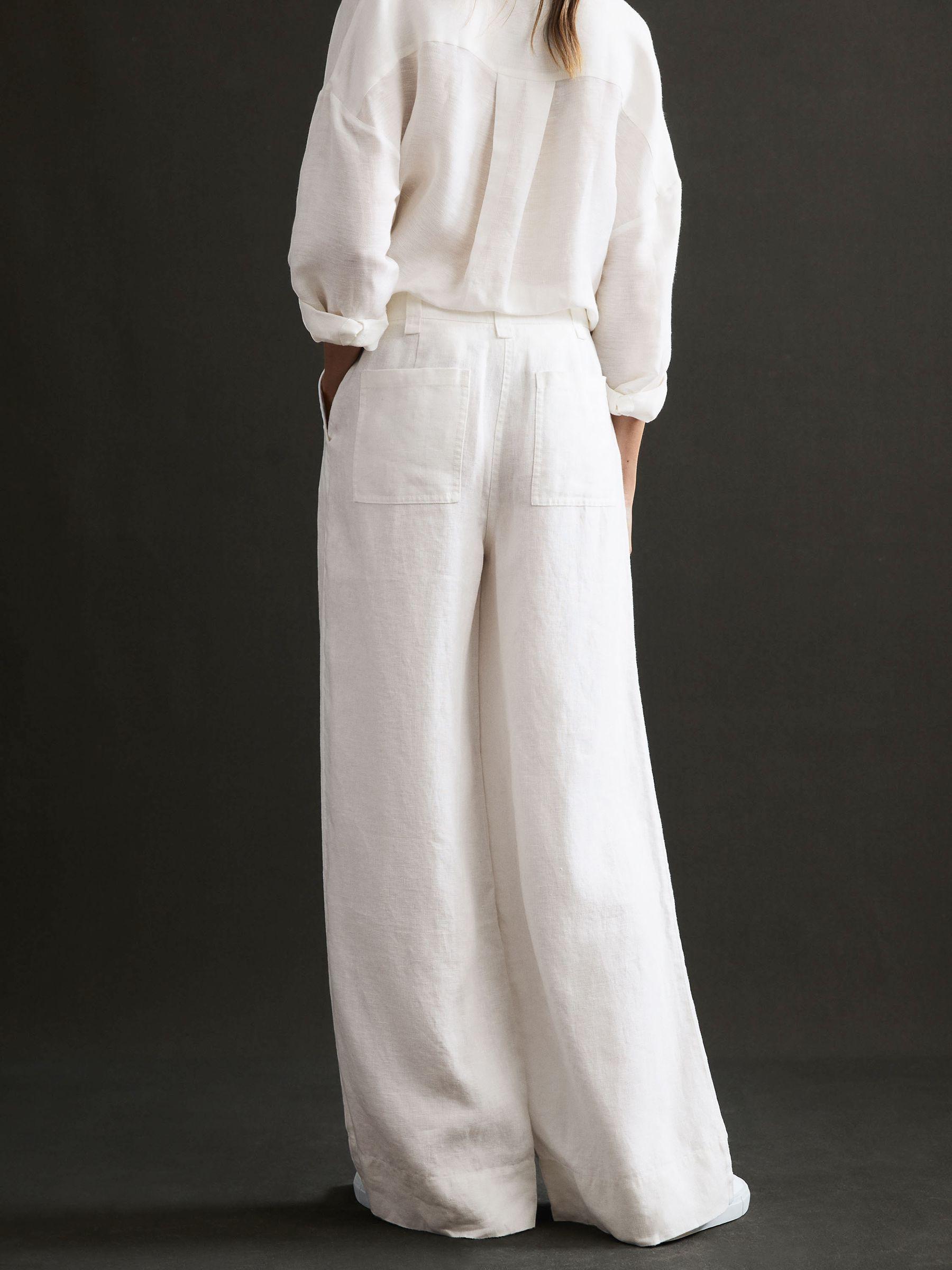 The Demi trousers are a linen option, rendered here in a white shade, ideal for summertime plans. This high-rise style has been garment-dyed for a soft touch and individual appearance, giving a fresh outlook to your rotation. Tuck in a relaxed-fitting shirt for effortless style. 100% linen Garment dyed High rise Wide leg Cotton lining The model is wearing a size 8 Measurements of model: Height 5ft 10" / 178cm
