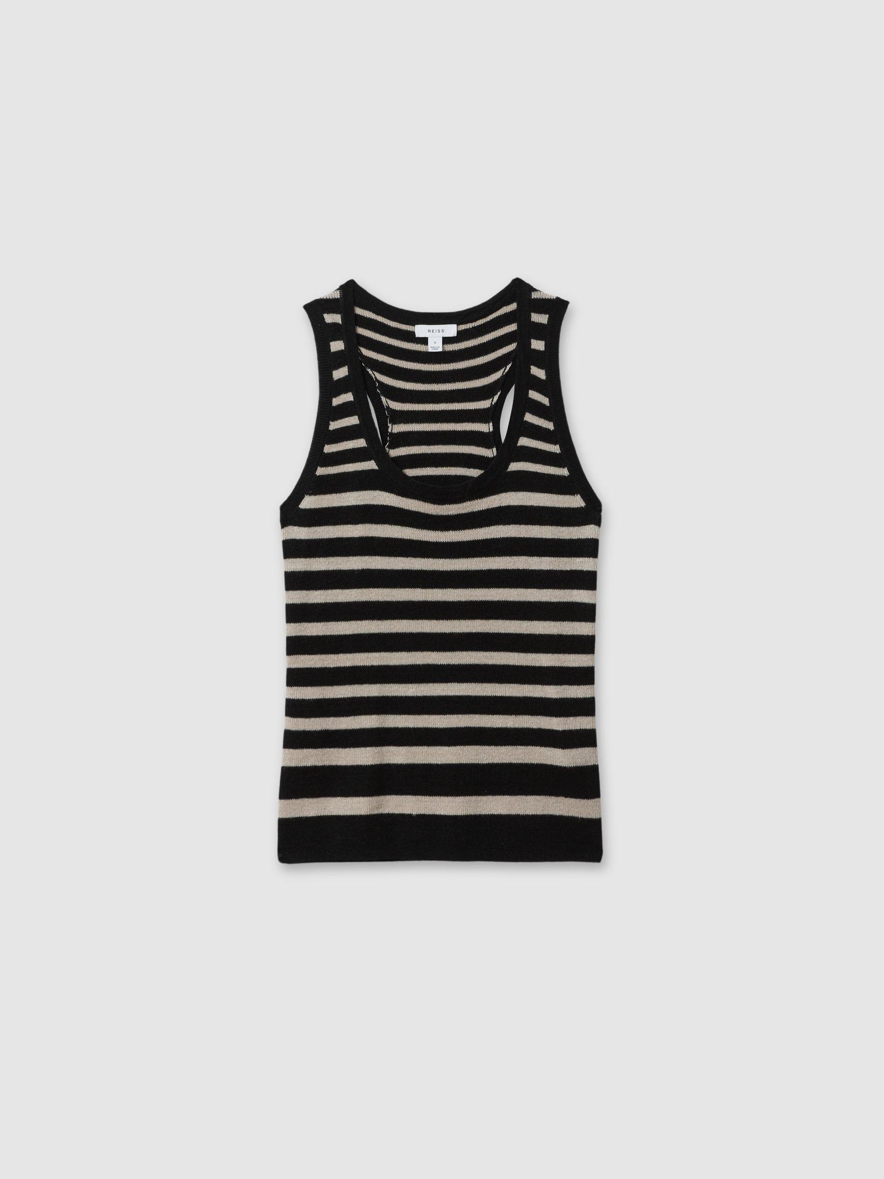 The Everlyn vest has a soft knitted construction, woven from a blend of linen and wool. It’s arranged with a scoop neckline and a racerback finish, designed to hug the body. Linen-wool blend Striped Scoop neckline Racerback design. The model is wearing a size S Measurements of model: 5ft9” / 175cm.