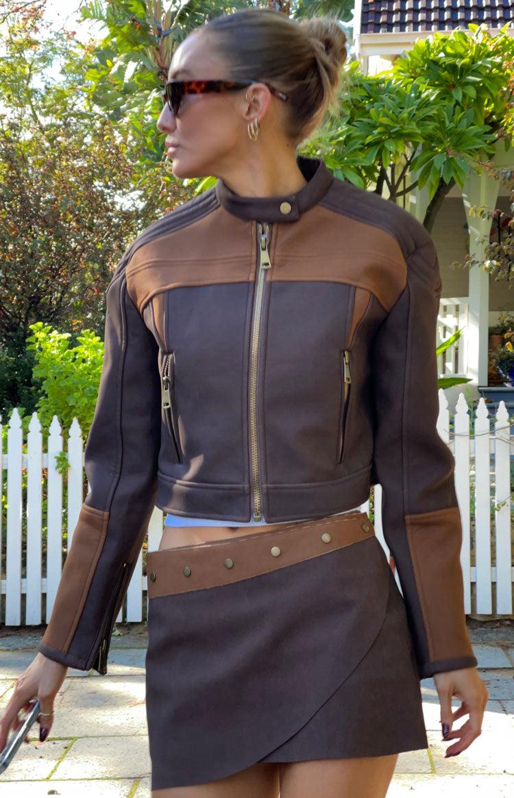 Chocolate Leather Biker Jacket by Lioness HOW TO STYLE: This Lioness biker jacket is the ultimate cool girl style. Elevate this street look with a black mini dress and chunky boots FEATURES: Vegan leather Racer jacket style Contrast brown fabric panel detailing Press stud collar Front zip Cuff and pocket zip detailing Fully lined