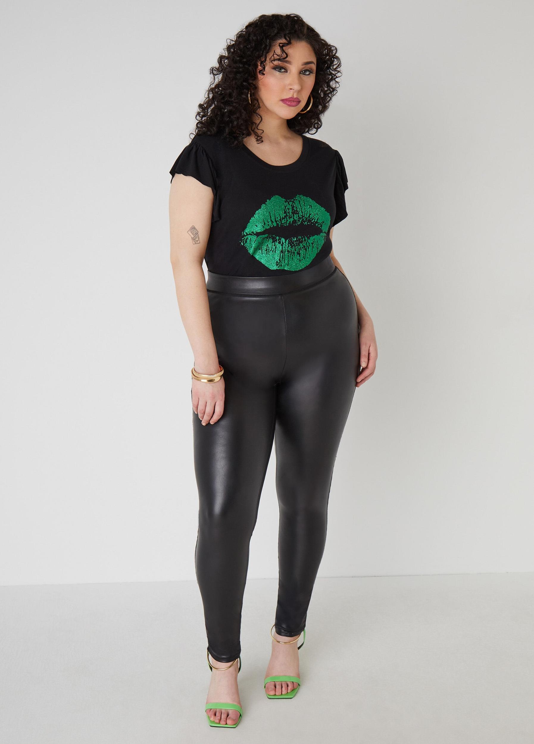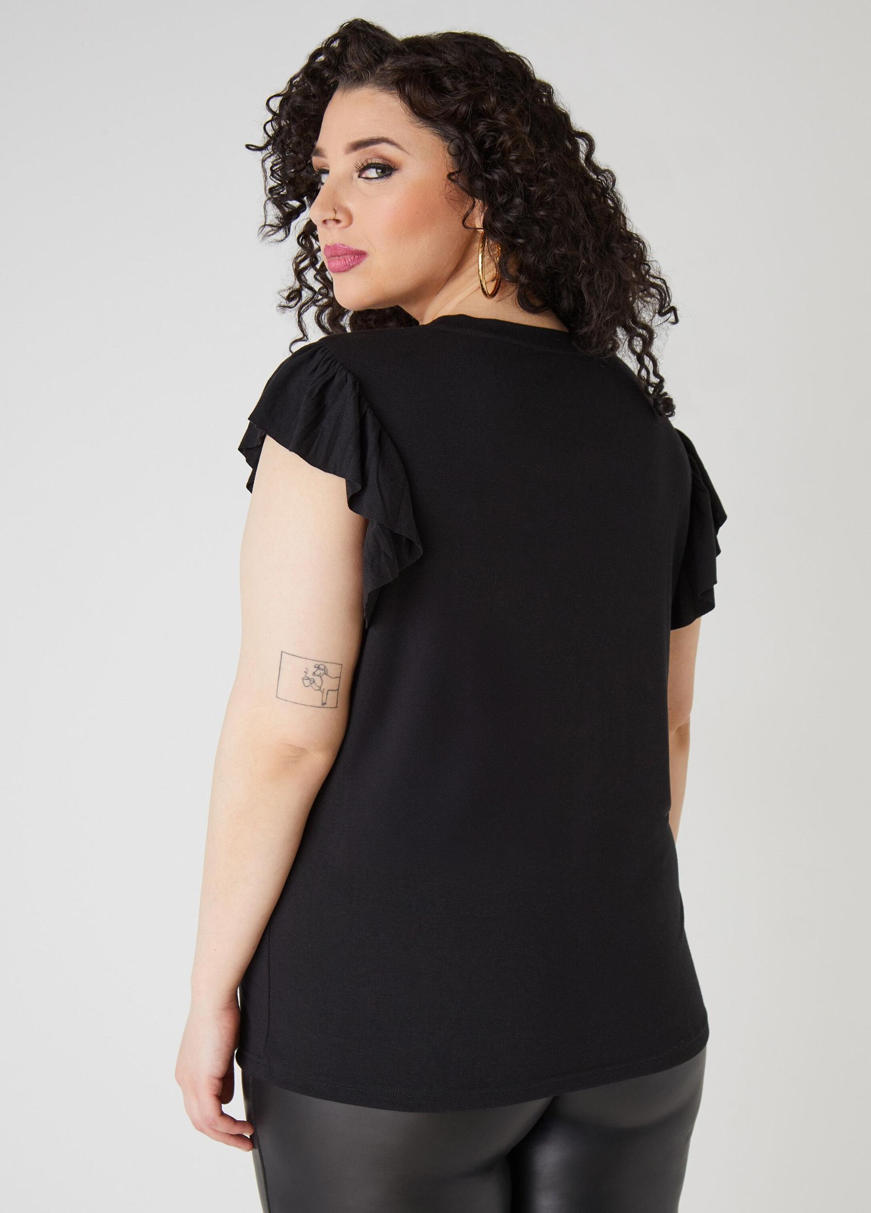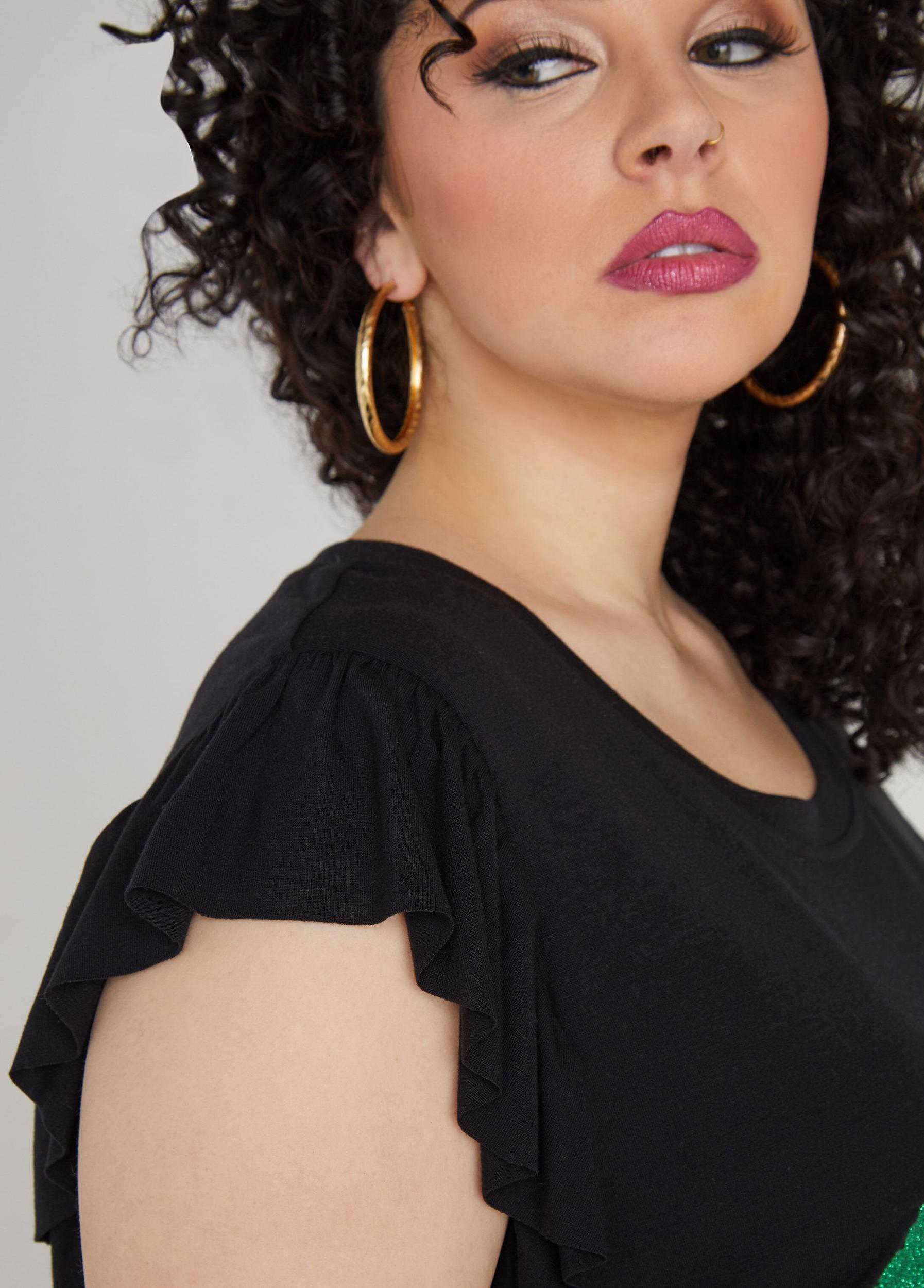 This lips tee combines playful elegance with a touch of sparkle. Featuring a glittered graphic & feminine ruffled sleeves, it adds a fun twist to any casual look. Crafted for comfort and style, this tee offers the perfect balance of chic and cozy.