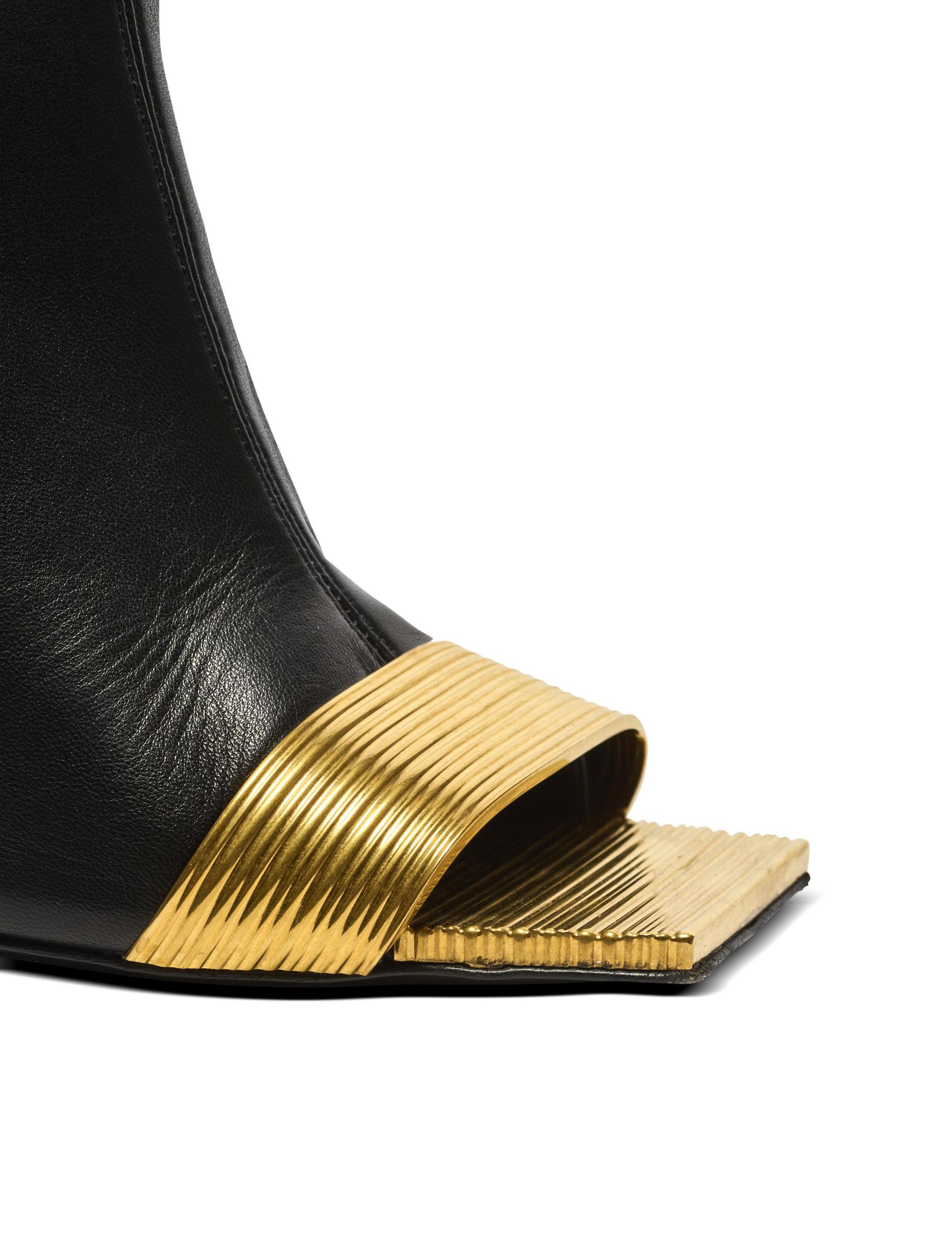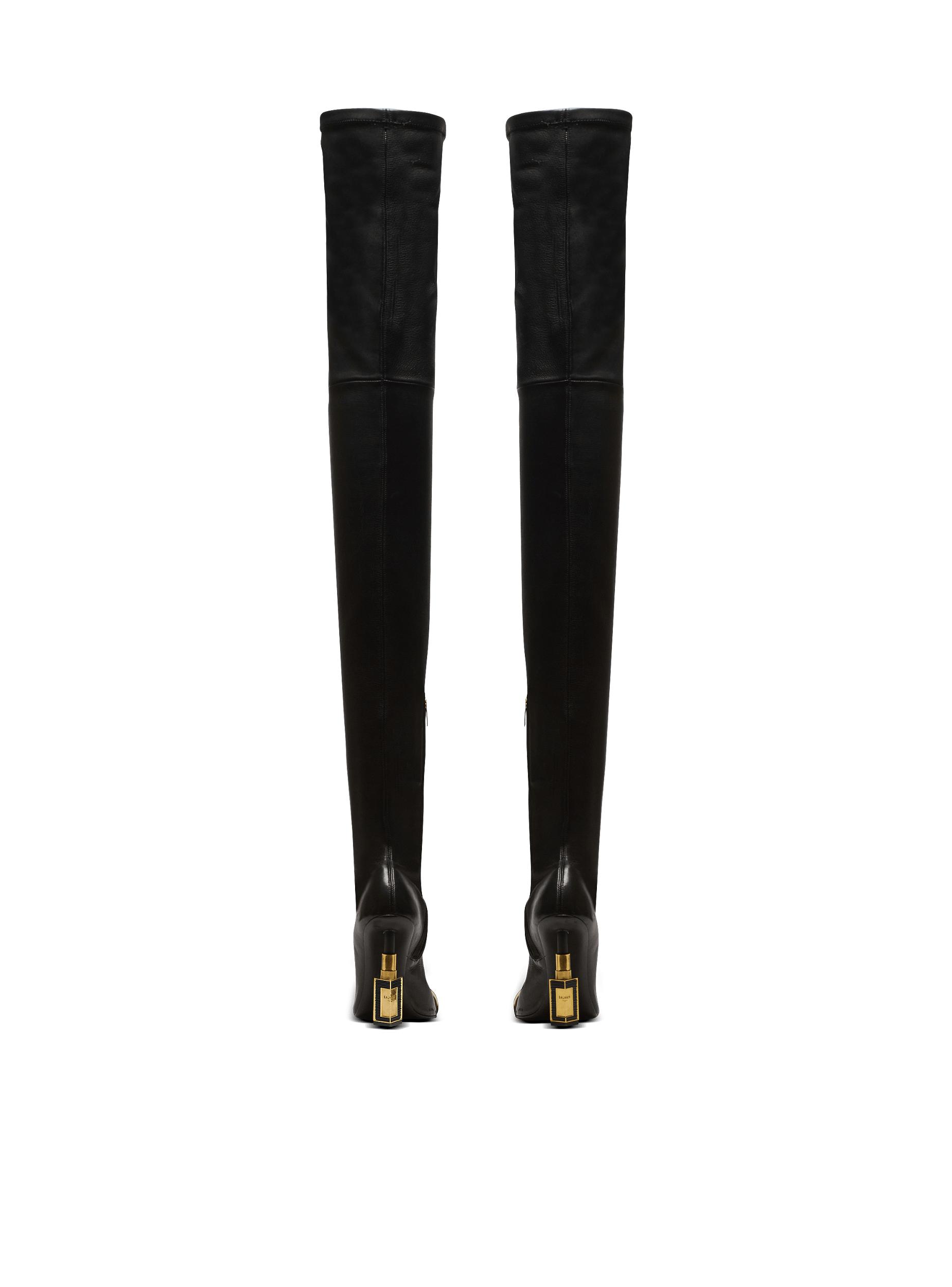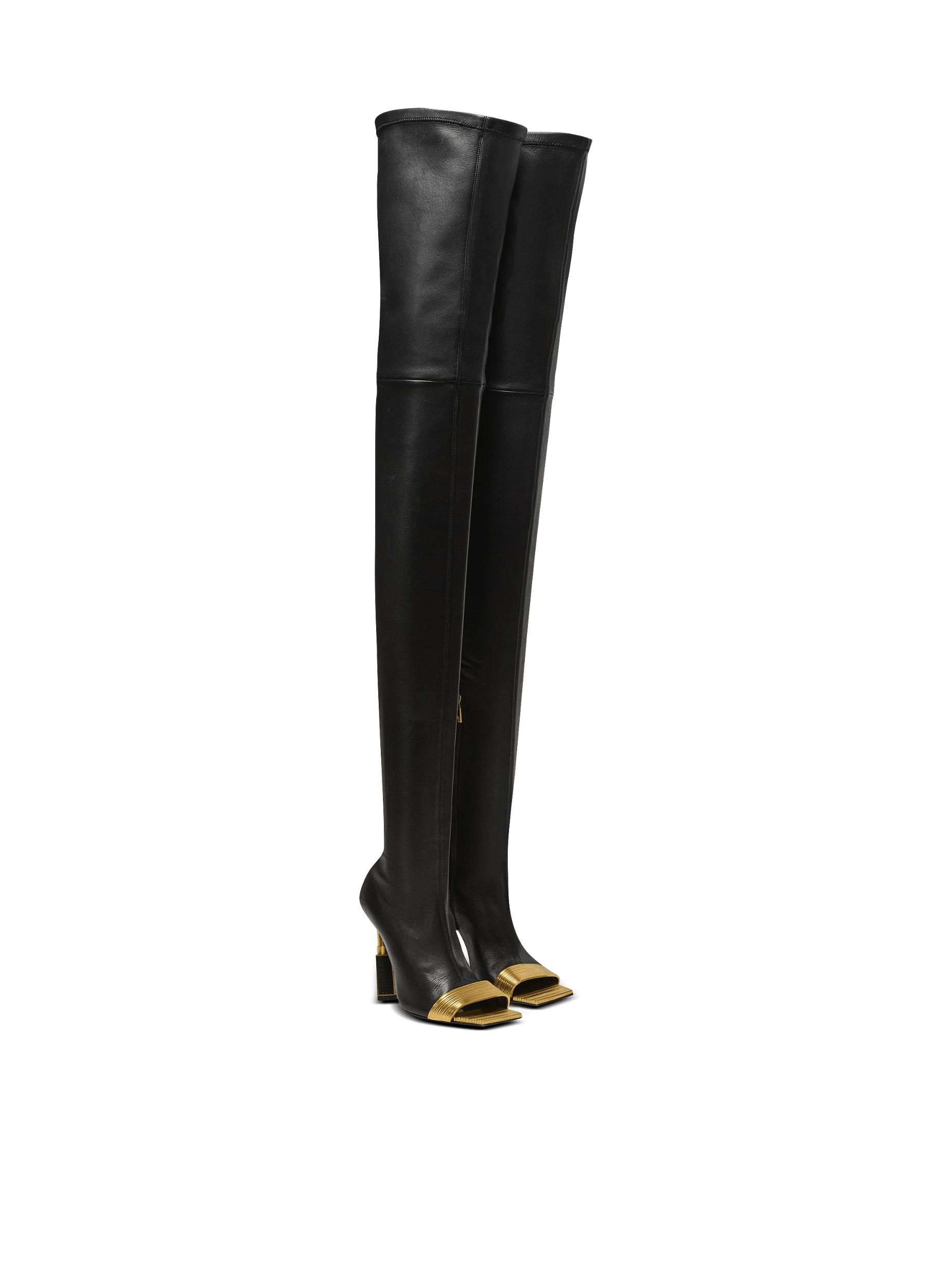 Lipstick thigh-high boots in lambskin, mirror-effect leather and brassOpen square toeToe and opening in gold, striped, mirror-effect leatherSide zip with Balmain Paris-engraved sliderBrass lipstick-shaped stiletto heelLeather outsoleDiamond-embossed leather insoleJersey liningHeel height: 9.5 cmMain material: 100% lambskinMade in ItalyItem: EN0TB122LBNP