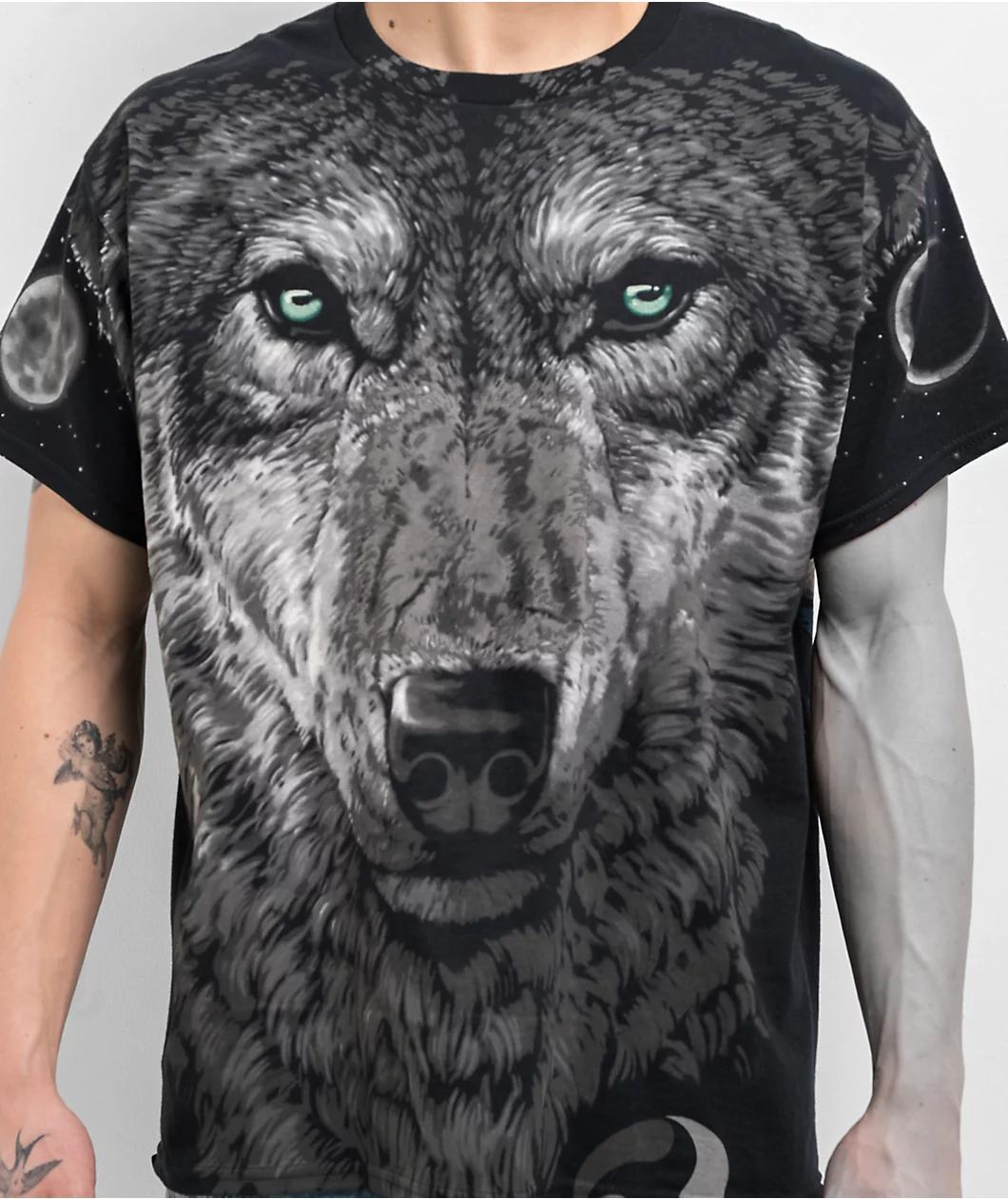 Embrace your inner alpha or omega with the Arctic Wolf t-shirt from Liquid Blue. A grey Wolf covers the front of the black tee, with a full and crescent moon on either sleeve to further the wild canine look. The back features artwork of a lone Wolf s