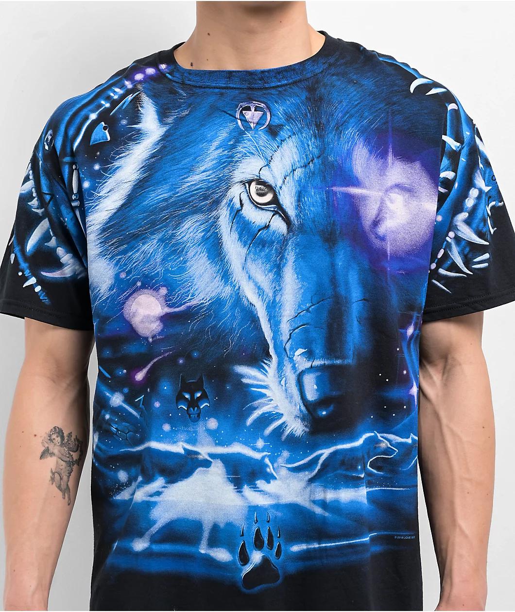 Add a galactic vibe to your outfit with the Wolf t-shirt from Liquid Blue in a black colorway. This graphic tee has a large Wolf head on the front decorated with stars and planets throughout. The back of the shirt has a detailed dream catcher with de