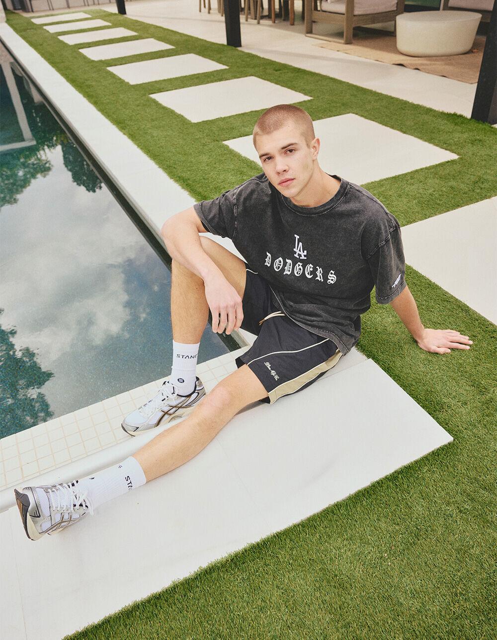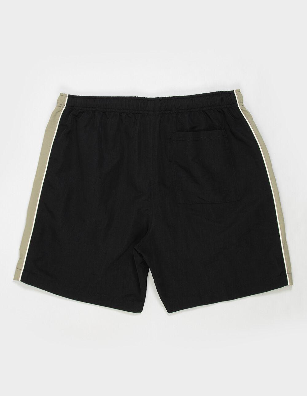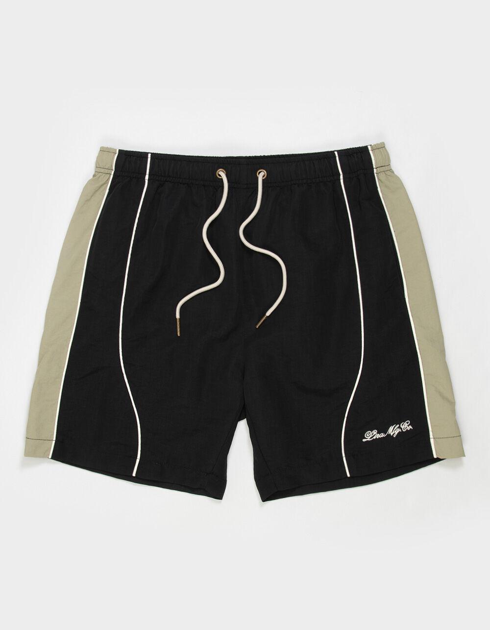 LIRA Nylon Pieced Shorts. Elastic waistband with drawstring. Lira Mfg. Co. embroidery at lower left leg. Piping details. Contrast color side panels. Back right pocket. Approximate inseam: 6". Approximate outseam: 16". 100% Nylon. Machine wash. Imported.