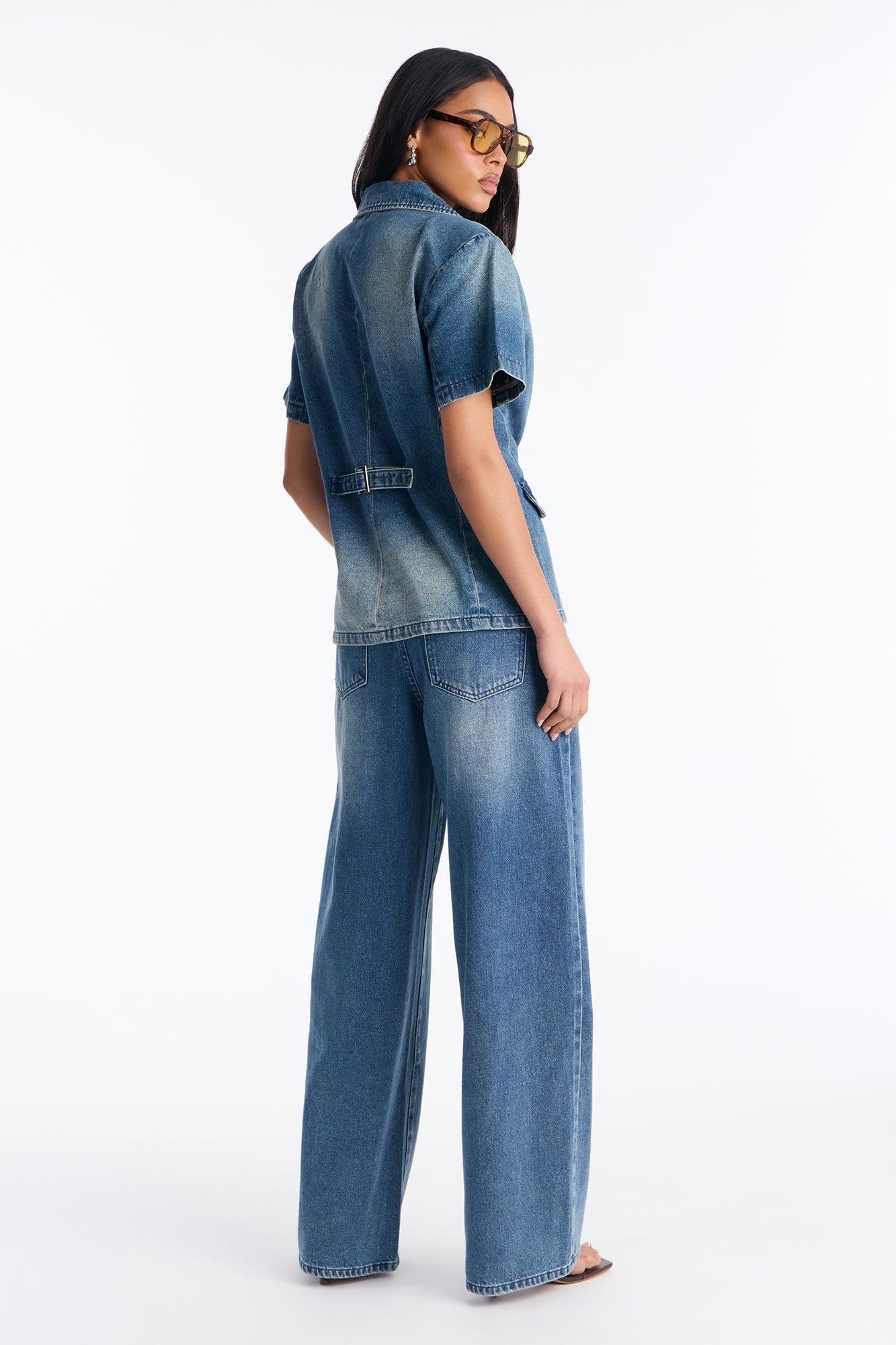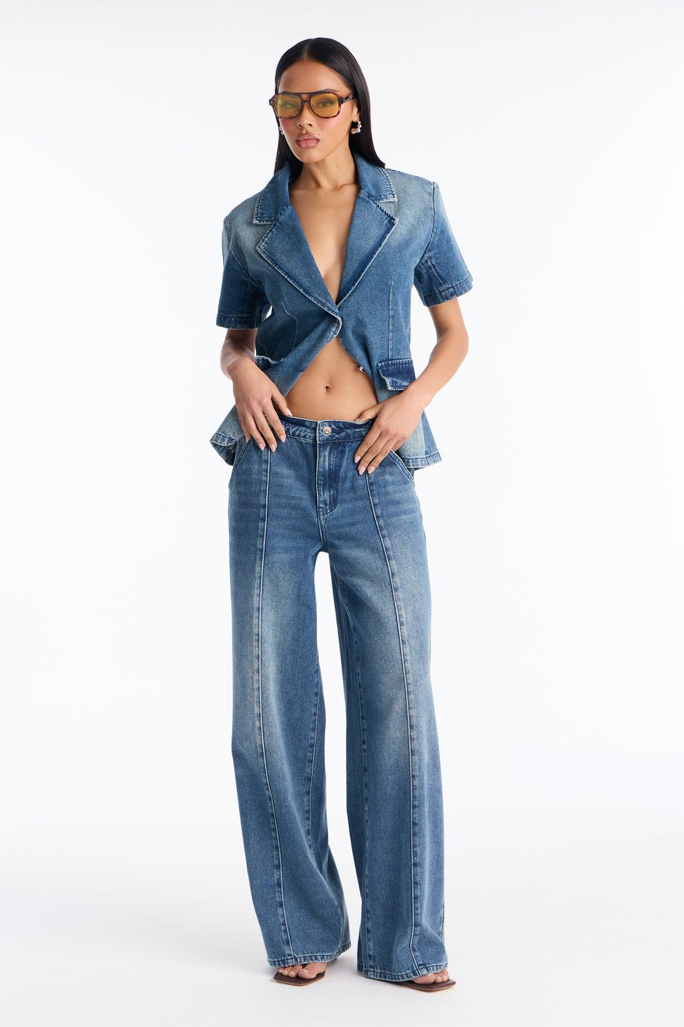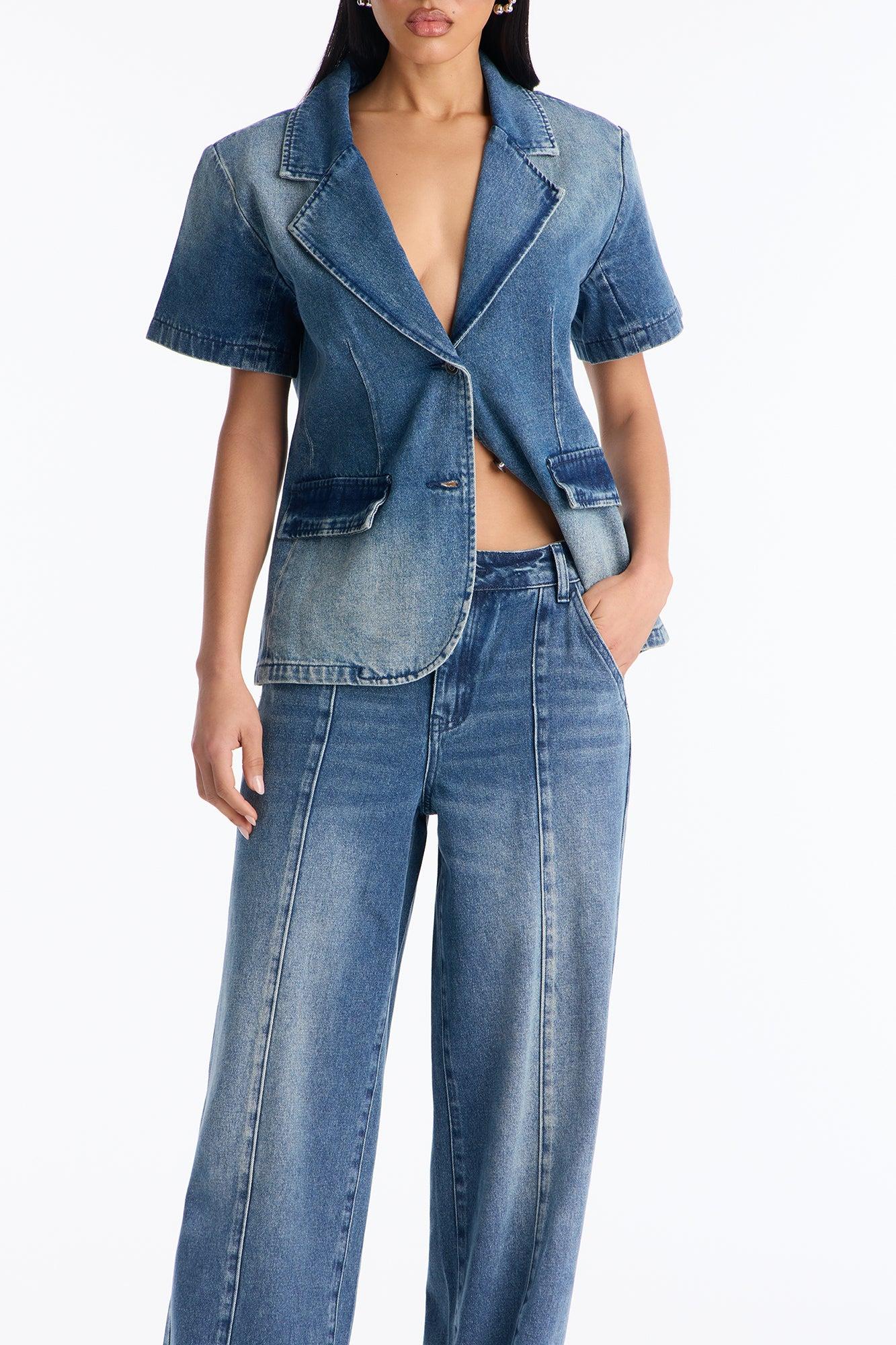 Available In Denim. 2 Piece Ensemble Short Sleeve Blazer And Wide Leg Pant Set Non-stretch Button And Zipper Pant Closure Pockets Shoulder Pads 32.5" Inseam Self: 85% Cotton 15% Polyester Imported California Proposition 65WARNING: Cancer and Reproductive Harm - www.P65Warnings.ca.gov.