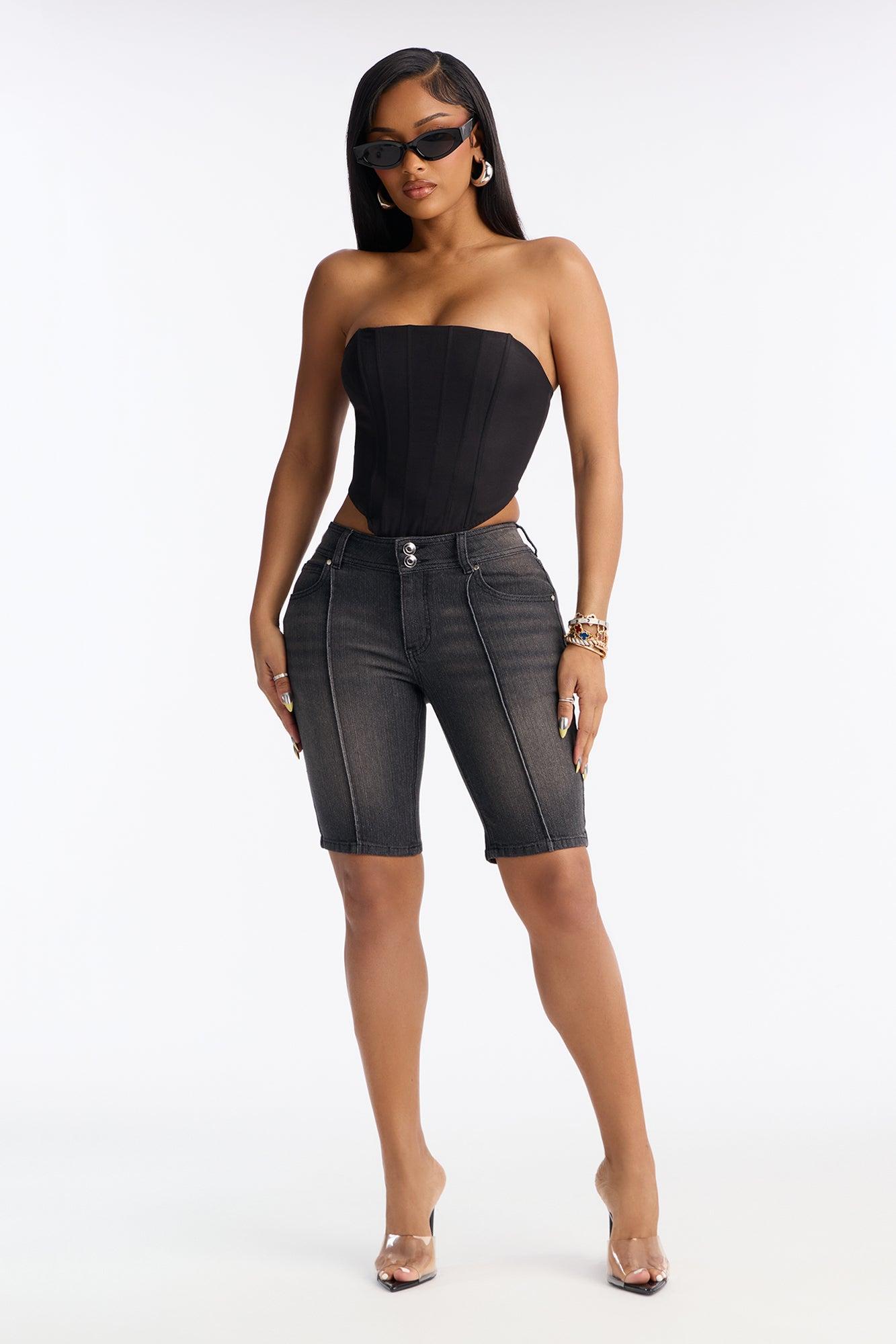 Available In Grey. Denim Bermuda Short 5 Pocket Detail Double Button Pintuck Detail 8.5" Low Rise 10" Inseam Medium Stretch 55% Cotton 24% Polyester 20% Viscose 1% Spandex Imported California Proposition 65WARNING: Cancer and Reproductive Harm - www.P65Warnings.ca.gov.