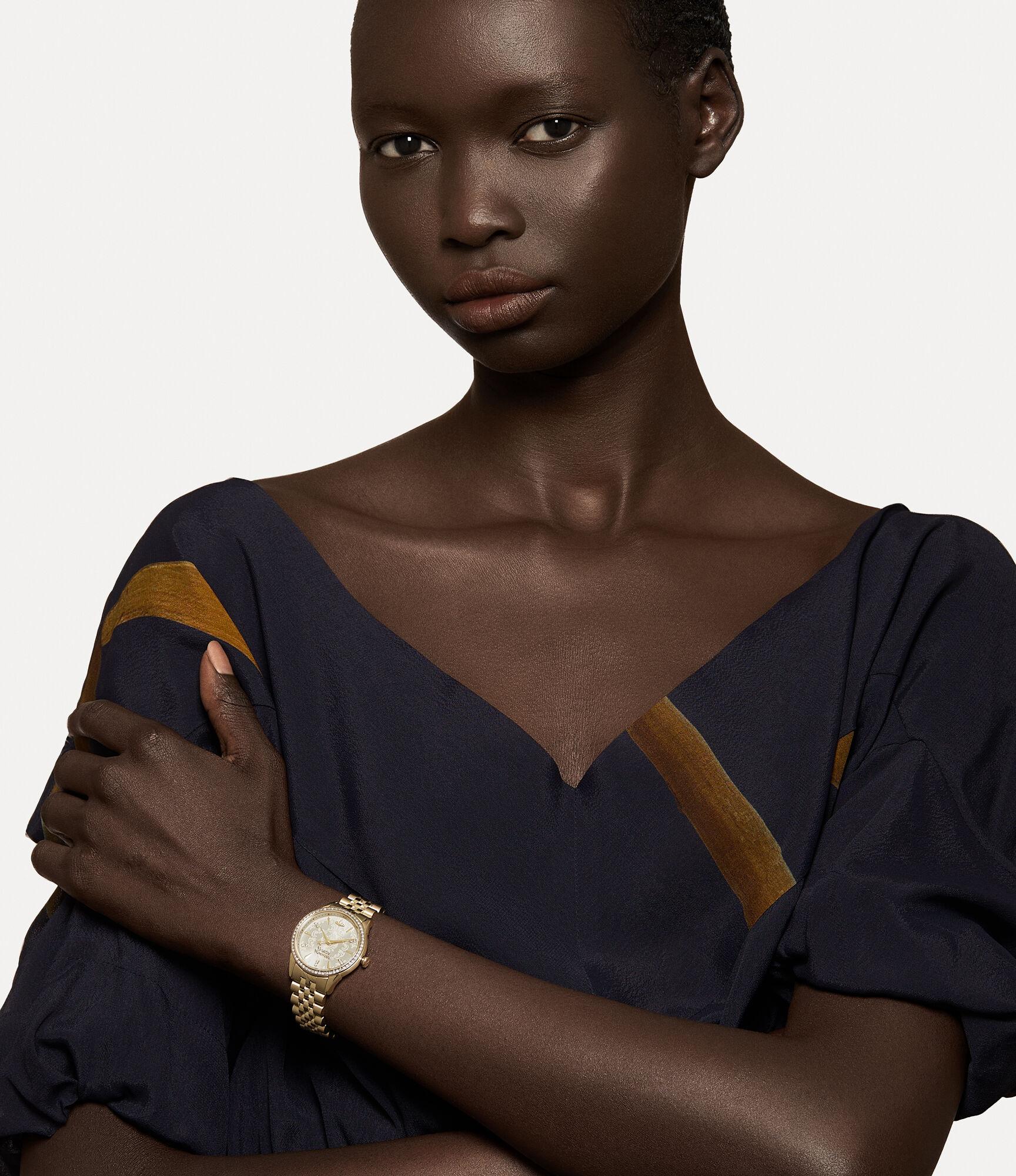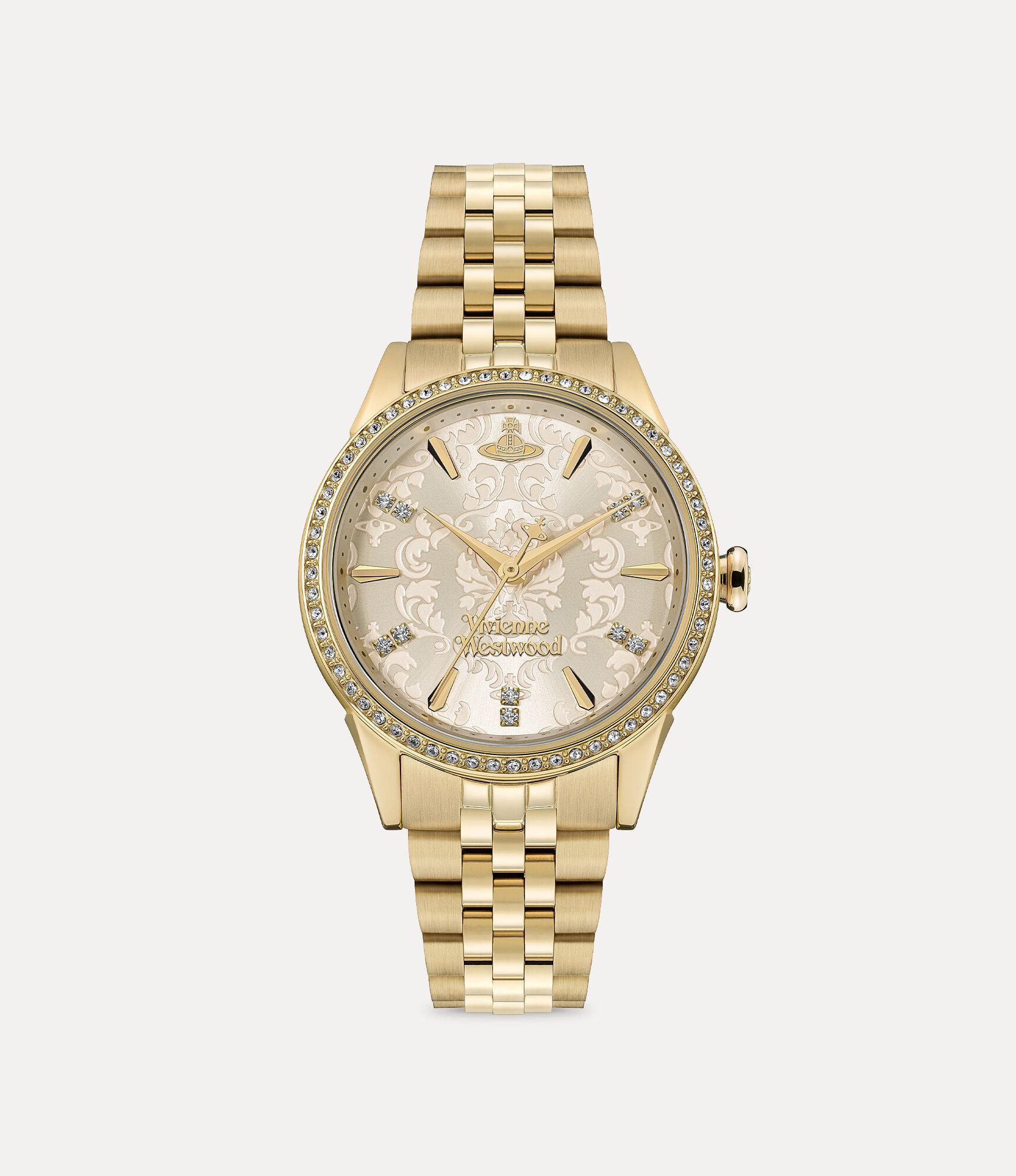 The design of our Little Wallace watch recalls the interiors of the Wallace Collection, complete with a gold-toned metal bracelet, Swarovski crystal details and an intricate jacquard-etched dial. The piece is branded with an orb-adorned second hand and crown, synonymous with Vivienne's vision of launching tradition into the future.