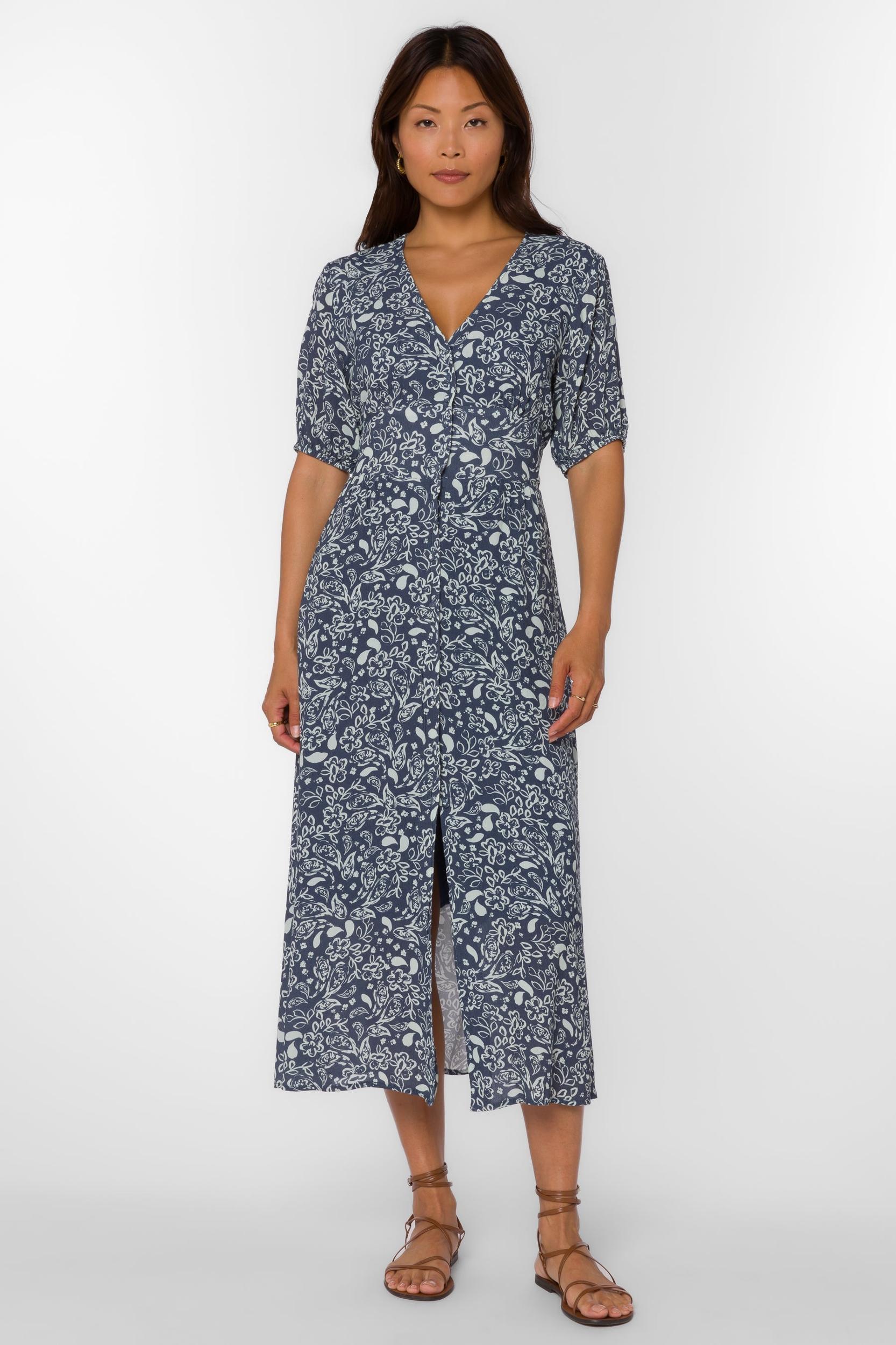 Introducing the Livana Dress, a beautifully crafted midi dress designed to bring effortless sophistication to your wardrobe. This dress features short puff sleeves and a flattering V-neckline, with a front button closure that adds a touch of classic charm. Made from 100% viscose, the fabric feels soft and lightweight, with a gentle drape that moves beautifully with you.