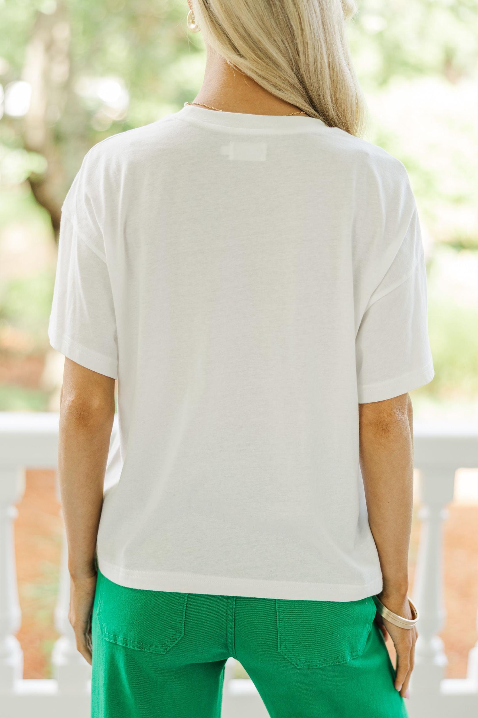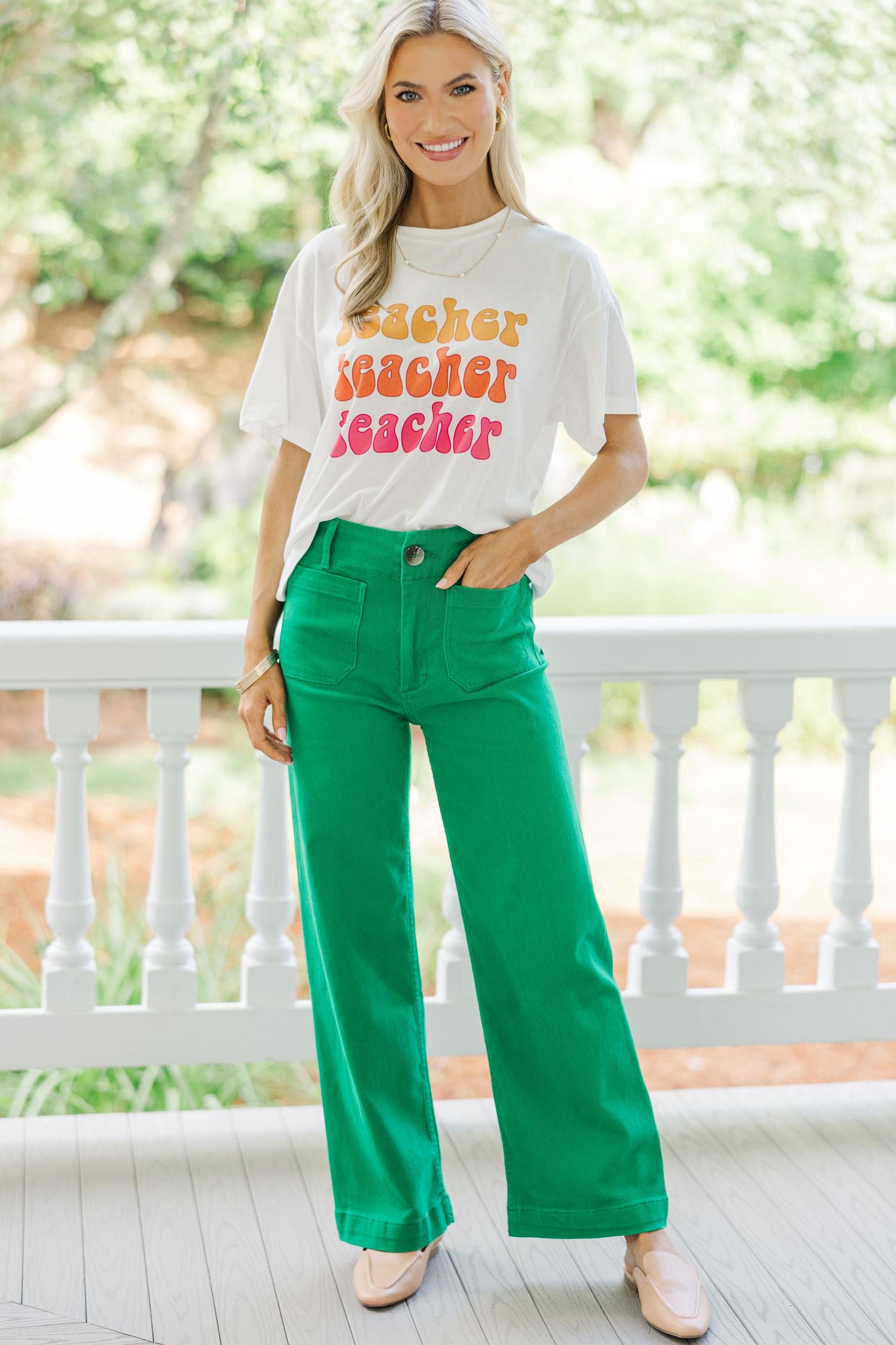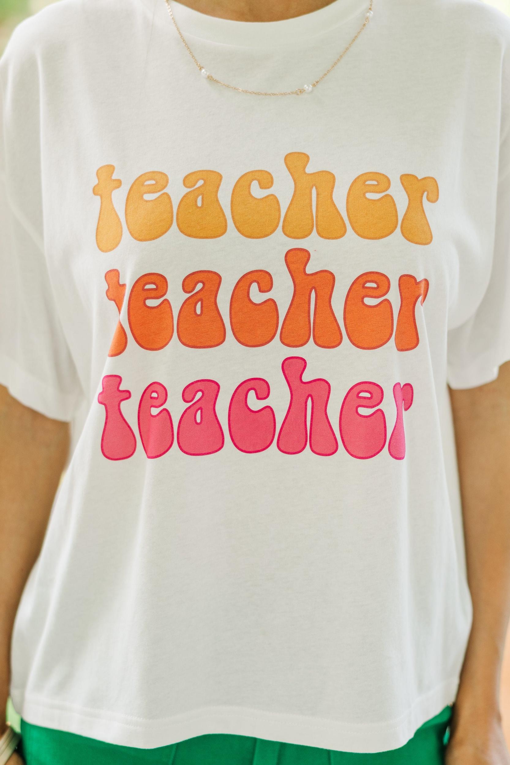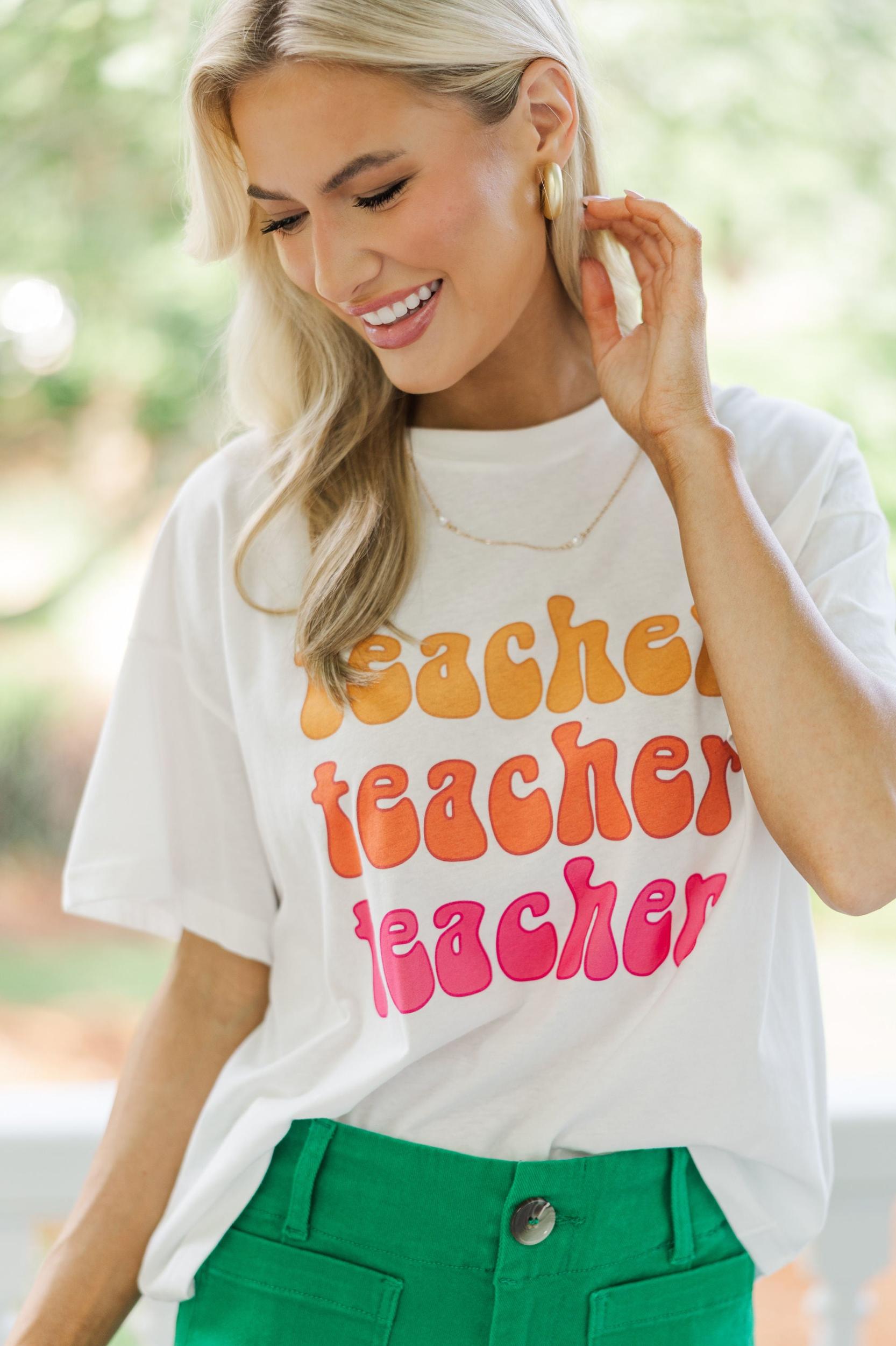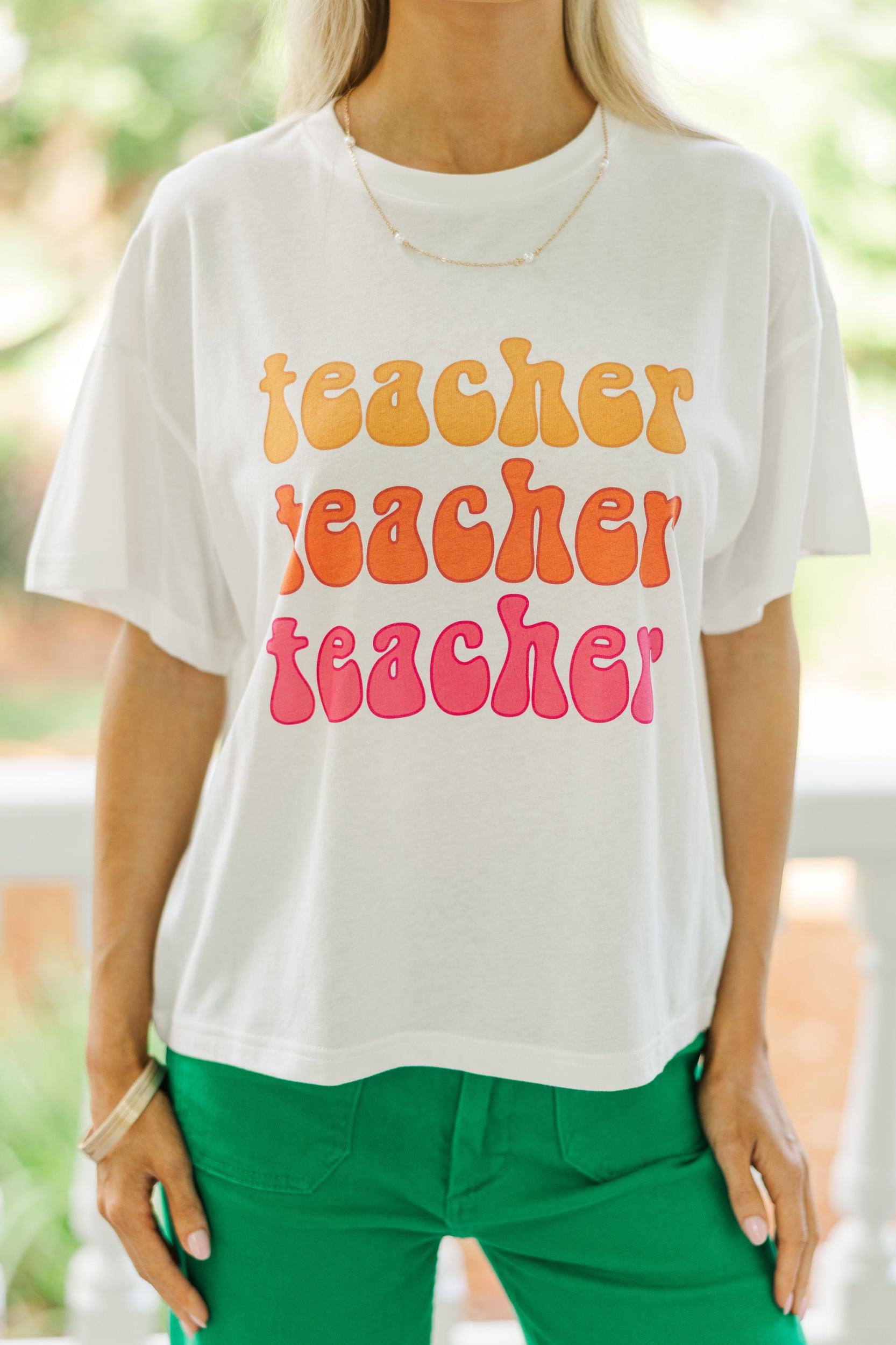 Say it loud and proud—teacher, teacher, teacher! This retro-inspired tee is bursting with groovy vibes in warm ombré tones that pop against classic white. With its relaxed fit and cheerful design, it’s the perfect way to celebrate your calling in style. Just add your favorite colorful pants and get ready to rule the classroom in comfort and confidence! Round Neckline Short Sleeves Teacher Graphic Material has generous amount of stretch Baileigh is wearing the small.