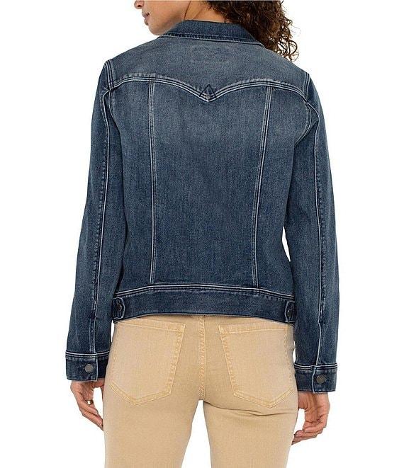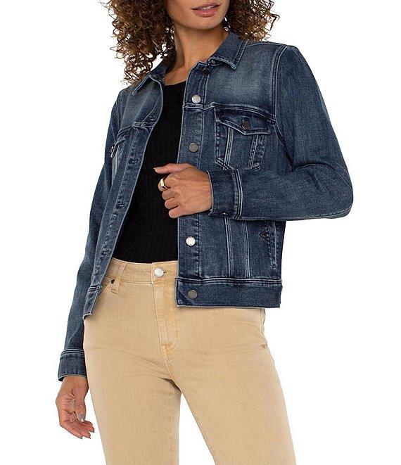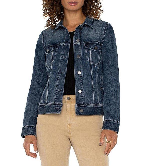 From Liverpool Los Angeles, this jacket features: stretch denim fabrication collared neckline long sleevestwo front button flap pockets two side seam pockets front button closure approx. 23.5" length cotton/polyester/elastane machine wash/tumble dry Imported.