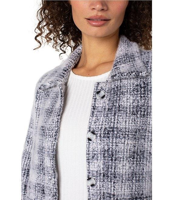 From Liverpool Los Angeles, this sweater jacket features: Feather jacquard fabrication Point collar Long sleeves Checker pattern Front seam pockets Straight hemline Button front closure Approx. 23.5" length Polyamide/viscose/polyester Machine wash Imported.