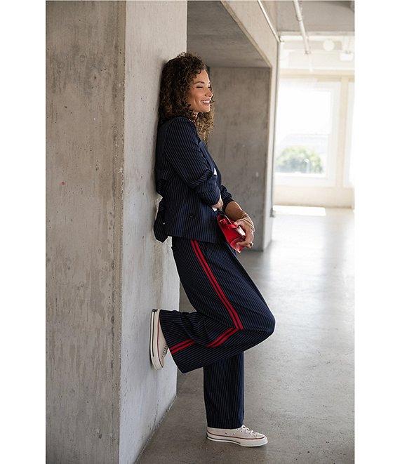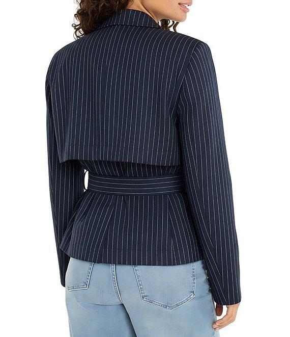 From Liverpool Los Angeles, this jacket features: Jacquard knit fabrication Pinstripe pattern Trench silhouette Notch collar neckline Long sleeves Unlined Thread belt loops Detachable self-belt Crop length Double button closure Approx. 22.5 Length Viscose/polyester/elastane Machine wash cold/flat dry Imported. This cropped trench jacket brings a fresh twist to classic style with its bold navy and white stripe print. The striped pattern adds a nautical-inspired edge, making it a versatile piece that can easily be dressed up or down.