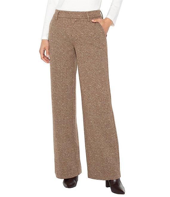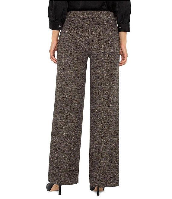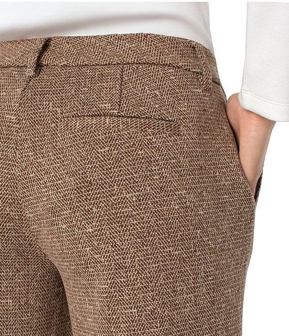 From Liverpool Los Angeles, these trousers feature: Knit herringbone fabrication Mid-rise Wide leg Slanted side pockets Welt back pockets Center front button/zip closure Approx. 31" inseam Polyester/rayon/spandex Machine wash/tumble dry Imported.