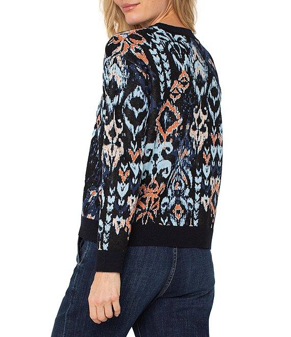 From Liverpool Los Angeles, this sweater features: Jacquard knit fabrication Crew neckline Long sleeves Ikat pattern Dropped shoulders Straight hemline Pullover construction Approx. 23.5" length Viscose/cotton Machine wash Imported.