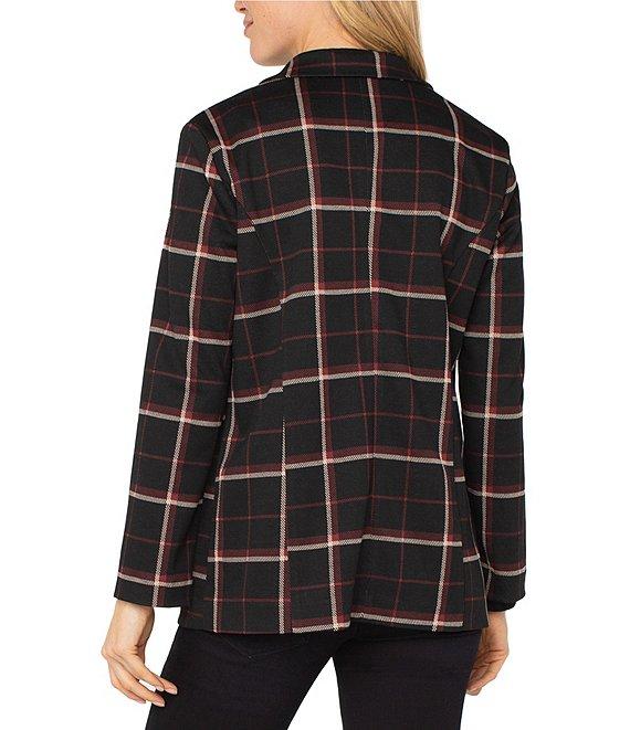 From Liverpool Los Angeles, this blazer features: Knit jacquard fabrication Boyfriend silhouette Notch collar Long sleeves Plaid print Front flap pockets Mid length Open front Approx. 28.5" length Polyester/rayon/spandex Machine wash cold Imported.