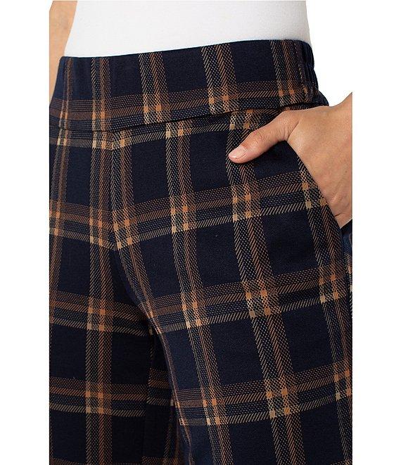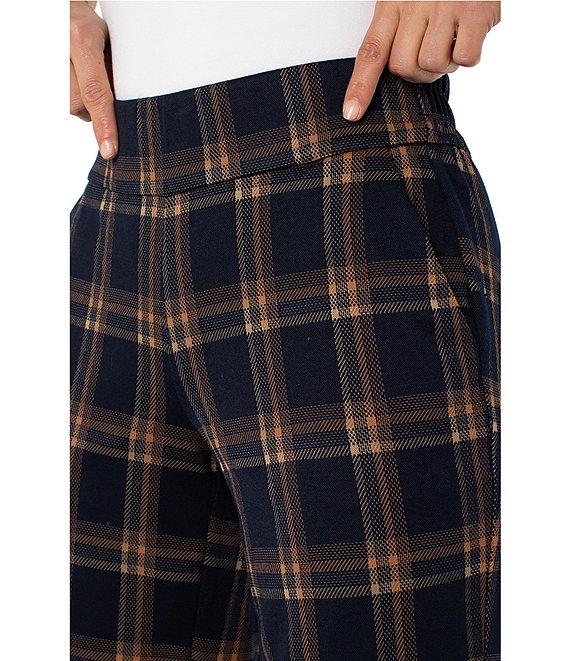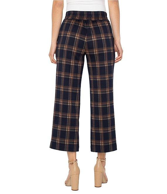 From Liverpool Los Angeles, these pants features: Stretch jacquard knit fabrication Wide leg silhouette Plaid print Mid rise Functional side pockets Oversized fit Crop length Pull-on construction Approx. 25" inseam, 20.5" leg opening, Front rise: 10.5", Back rise: 15.68" Polyester/rayon/spandex Machine wash Imported.