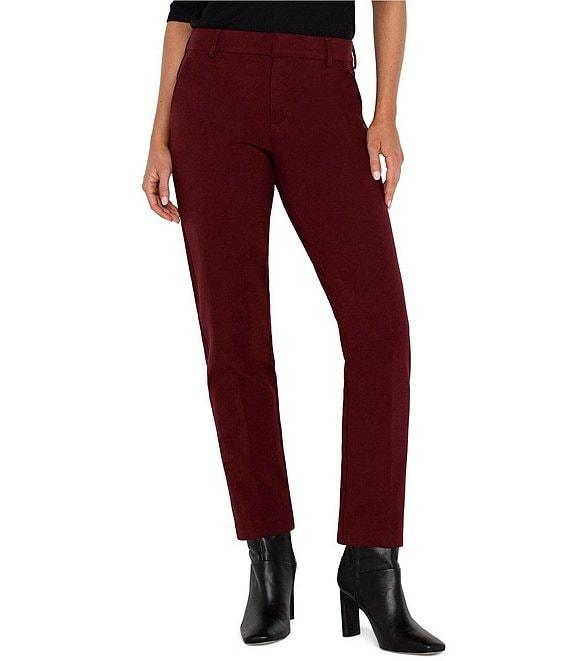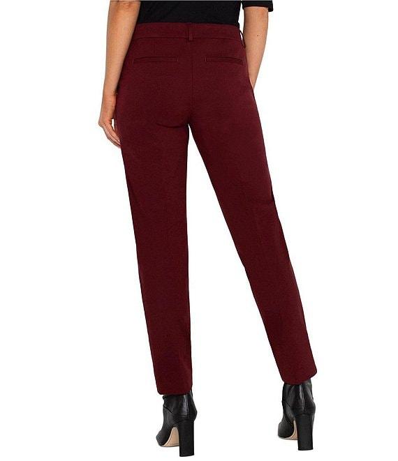 From Liverpool Los Angeles, these pants feature: Liverpool's signature trouser. Comfortable, with amazing stretch and recovery. The perfect career, casual, or travel pant. Super stretch ponte knit fabrication Flat front silhouette No front pockets Back welt pockets Zip fly with hook & eye closure Belt loops Slim straight leg Approx. 27" inseam, 13" leg opening, 8 7/8" front rise, 14" back rise Rayon/nylon/spandex Machine wash Imported.