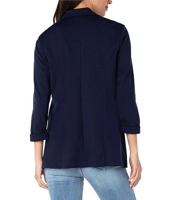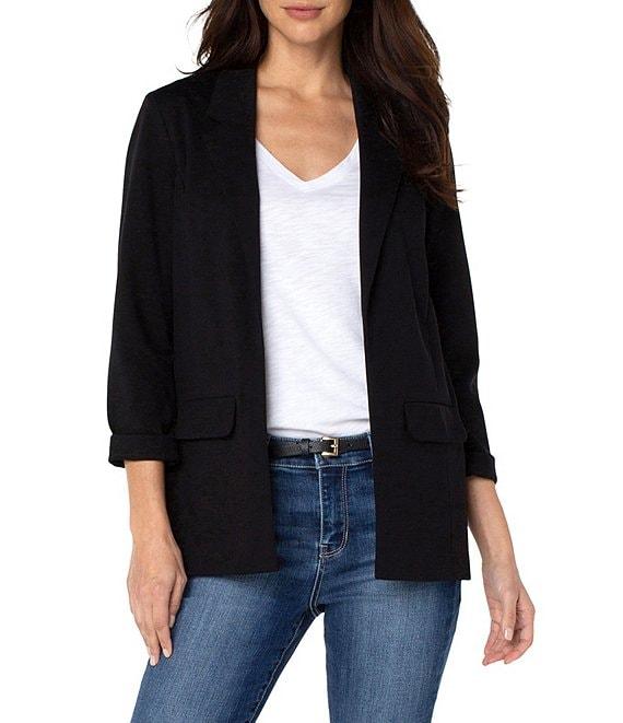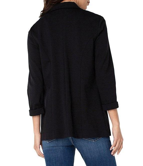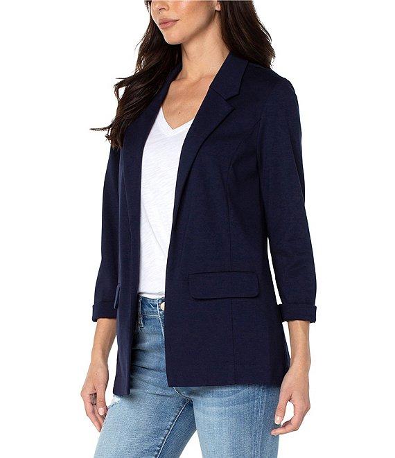 From Liverpool Los Angeles, this blazer features: Stretch ponte fabrication Notch lapel neckline 3/4 sleeves Front flap pockets Straight hemline Open front; no closure Approx. 28.5" length Rayon/nylon/spandex Machine wash cold inside out/flat dry Imported.