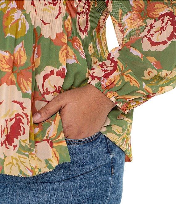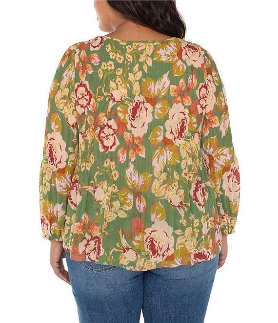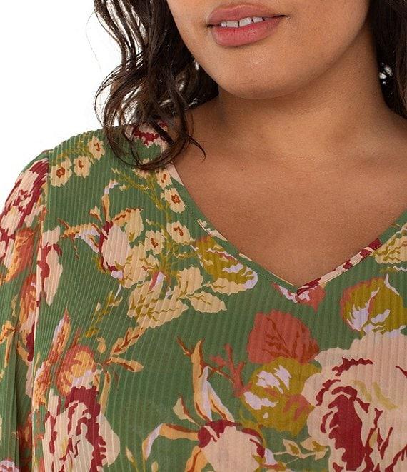 Liverpool Los Angeles Plus Size Chiffon Floral Print V-Neck Long Sleeve Pleated Top