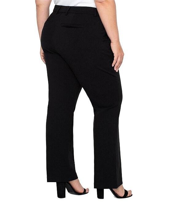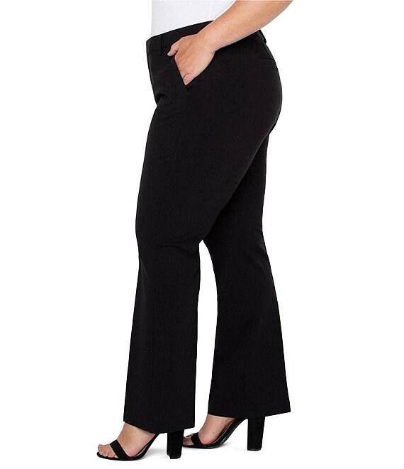 From Liverpool Los Angeles Plus, these pants feature: Super stretch ponte fabrication Mid rise Flare leg silhouette Two side pockets & 2 faux welt back pockets Set in waistband with belt loops Zipper/hook & bar closure Approx. 31" inseam, 21" leg opening; approx. 11" front rise; 18.25" back rise Rayon/nylon/spandex Machine wash/tumble dry Imported.