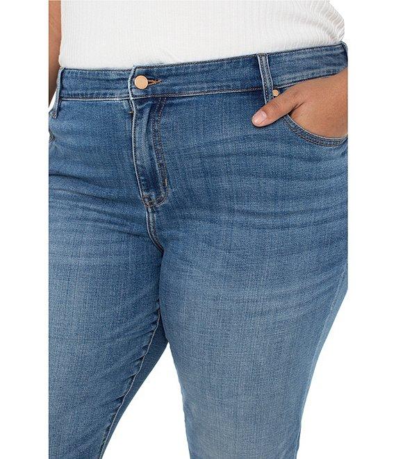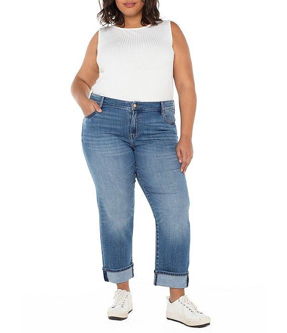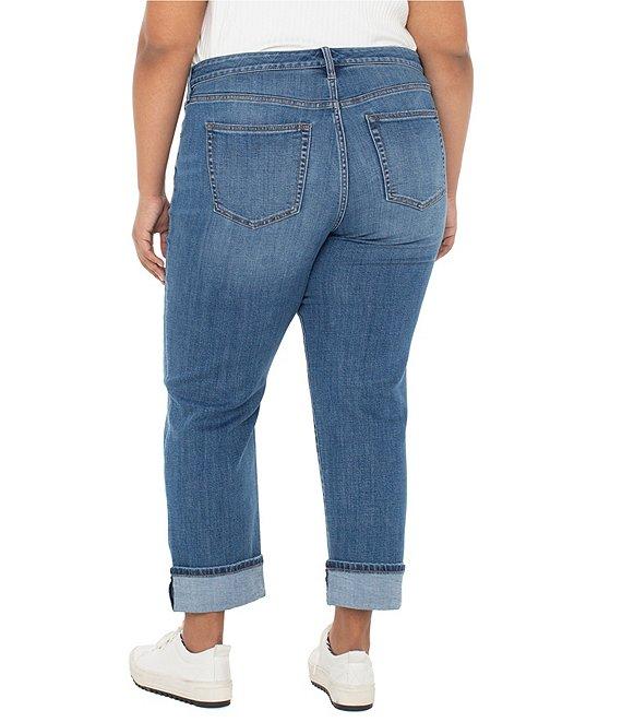 From Liverpool Los Angeles Plus, these jeans feature: Denim fabrication Girlfriend silhouette Belt loops 5 pocket style Cuff hem Front zipper and button closure Approx. 27" cuff, 30" uncuff inseam, 15.5" leg opening, Approx. 12" front rise, 18" back rise Cotton/lyocell/polyester/elastane Machine wash cold/tumble dry low Imported. The Marley is our signature girlfriend jean with a beautiful silhouette. Fits slimmer than a boyfriend but gives you the perfect amount of leg-room. A wide cuff on our girlfriend jean shows off your fabulous footwear. Our vintage denim adds just the right amount of character DETAILS: Mid-rise 5-Pocket styling details Zip-fly with single button closure Set-in waistband with belt loops.