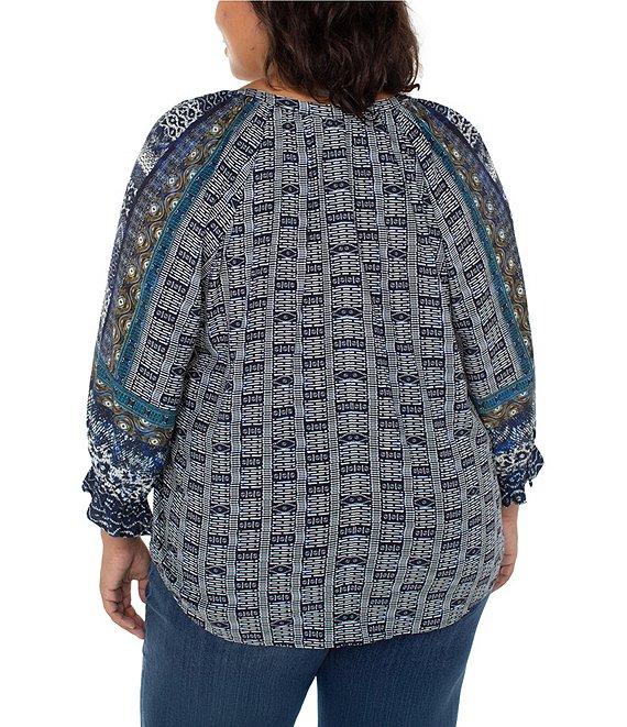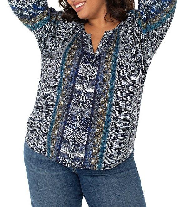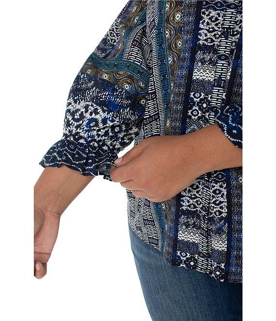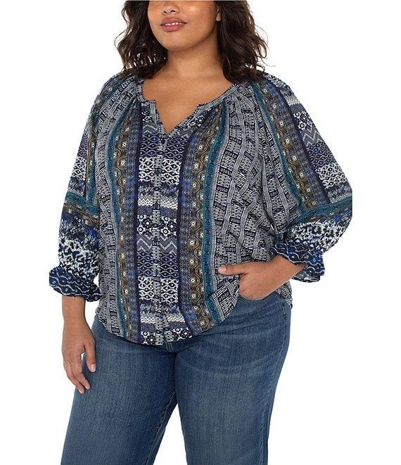 From Liverpool Los Angeles Plus, this blouse features: Woven fabrication Split v-neckline 3/4 sleeves Straight hem Button-front closure Approx. 28" length, from top shoulder to hem Rayon Hand wash cold/flat dry Imported. This button-front blouse is the perfect blend of contemporary femininity With this vibrant print, add a burst of color to your wardrobe, guaranteed to make a statement...or just to brighten your day