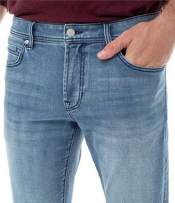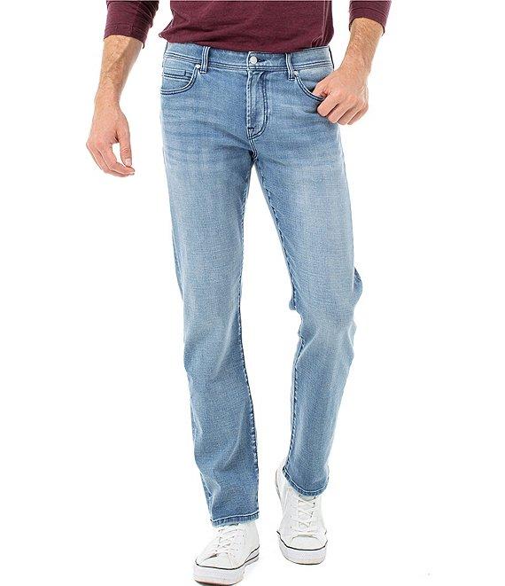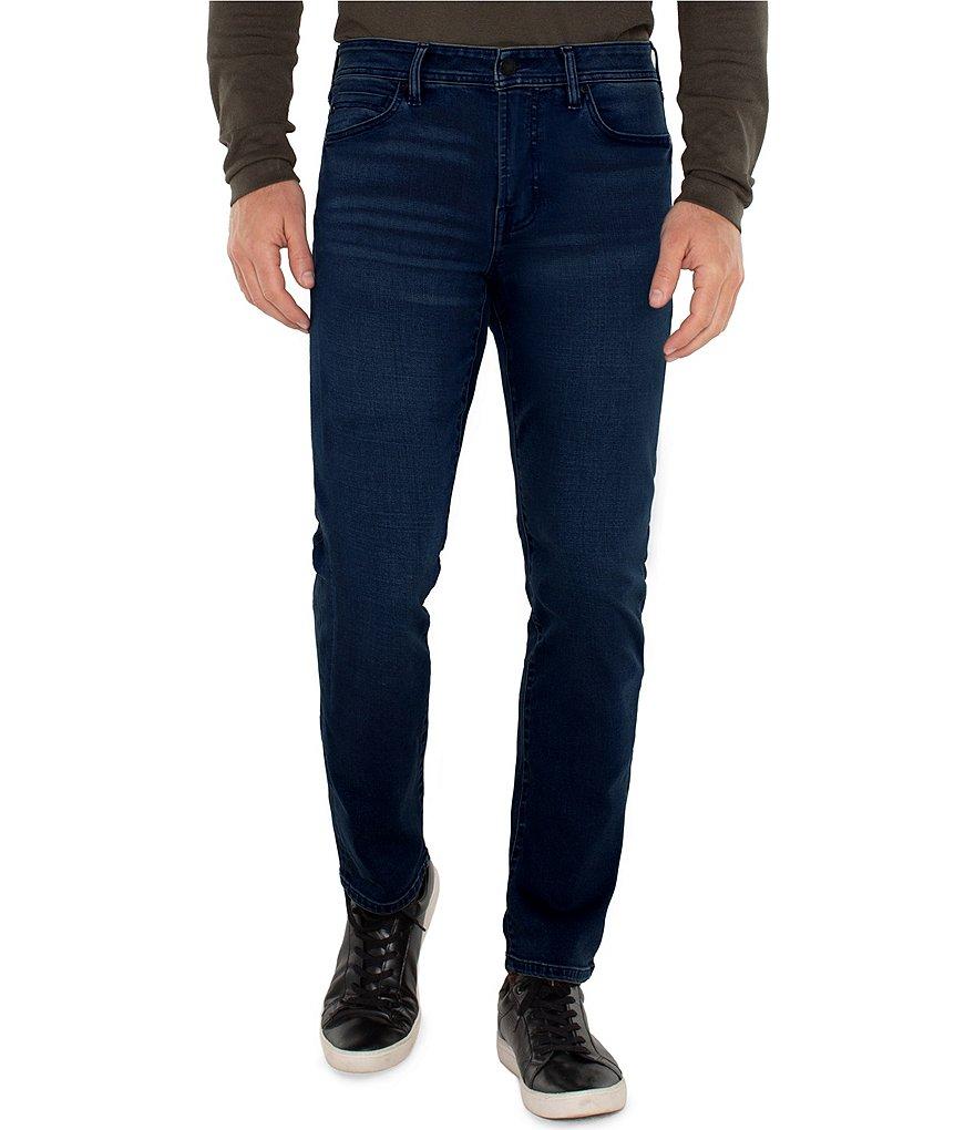 From Liverpool Los Angeles, these jeans feature: relaxed fit straight legs mid rise belt loops zippered fly with button closure two front pockets; one with coin pocket two back pockets flat-front styling tonal-stitching detail 15.5" leg openings Of cotton/polyester/spandex denim machine wash/tumble dry Imported.