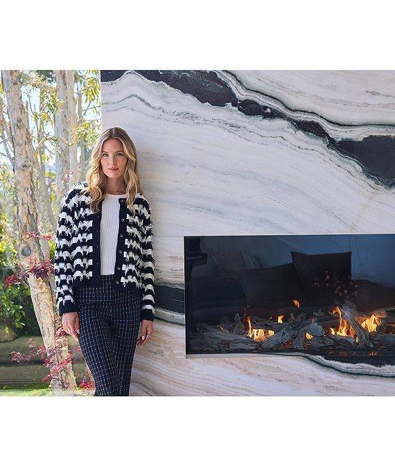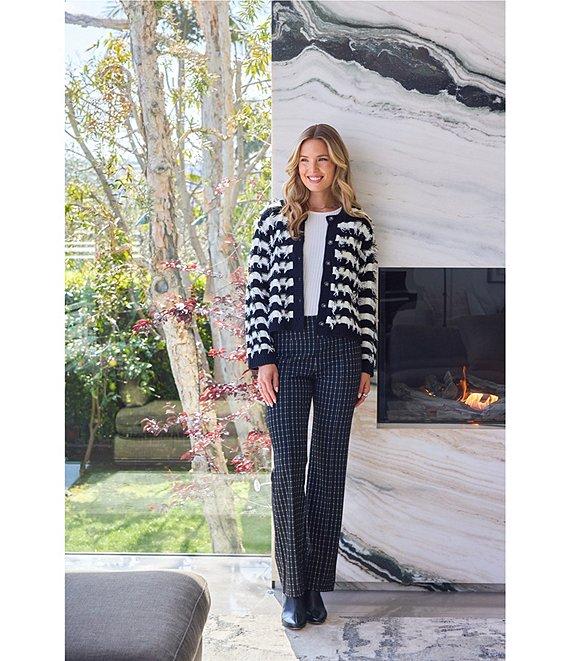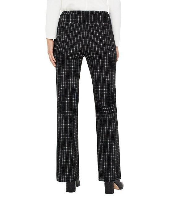 From Liverpool Los Angeles, these pants feature: Stretch knit jacquard fabrication Checkered pattern Flat front silhouette Flare leg with pintuck detail Full length Pull on construction Approx. 31" inseam, 18.75" leg opening, front rise:10.87", back rise:14.75" Polyester/rayon/nylon/spandex Machine wash cold/tumble dry low Imported.