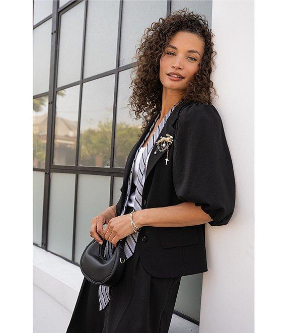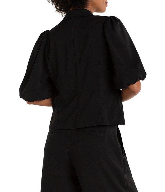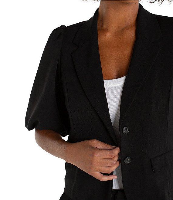 From Liverpool Los Angeles, this blazer features: Stretch woven fabrication Notch collar Short balloon sleeves Front flap waist pockets Lined Straight hemline Button front closure Approx. 23" length Polyester/viscose/elastane Machine wash Imported.