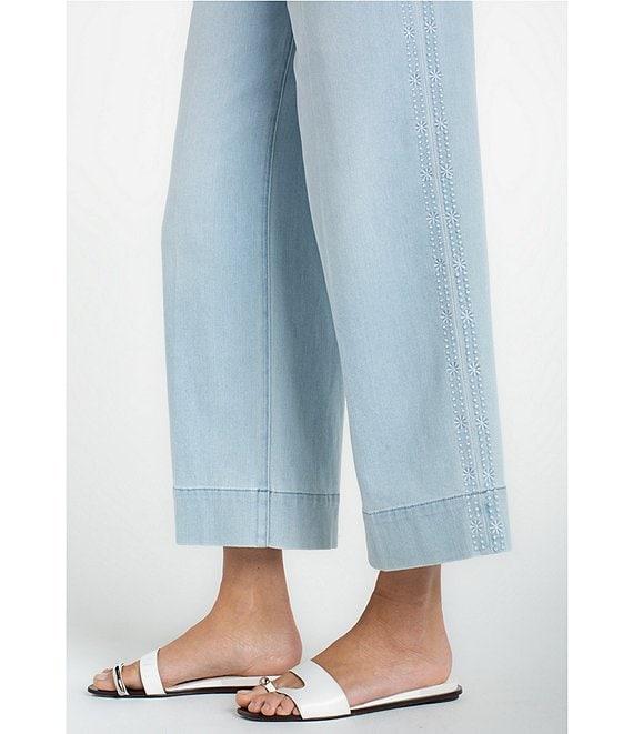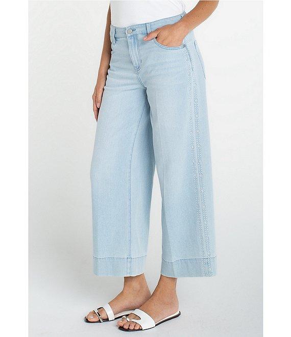From Liverpool Los Angeles, these jeans feature: Stretch denim fabrication Belt loops 5-pocket styling Wide leg silhouette Embroidered side seam Cropped length Front button and zipper closure Approx. 26" inseam, 22" leg opening, front rise: 10.25", back rise: 14.25" Cotton/polyester Machine wash Imported.