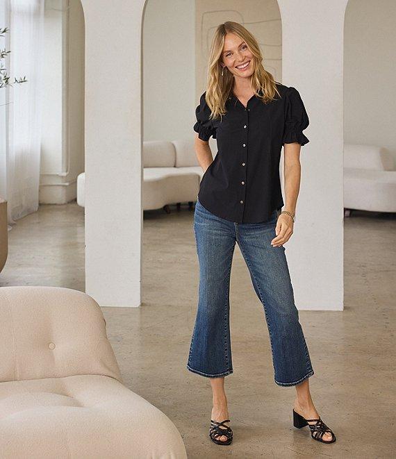 From Liverpool Los Angeles, this shirt features: Tech knit fabrication Spread collar neckline Elbow-length puff sleeves Slightly rounded hemline Full button-front closure Approx. 26" length Nylon/spandex Machine wash cold/dry flat Imported.