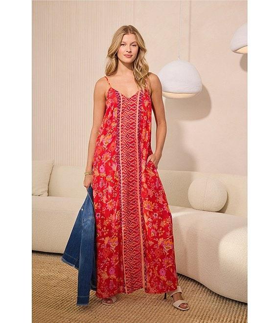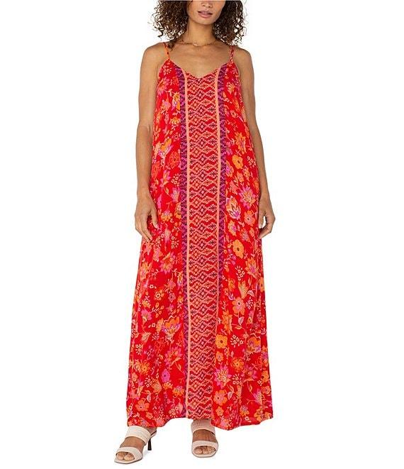 From Liverpool Los Angeles, this dress features: Woven fabrication A-line silhouette V-neckline Sleeveless with adjustable straps Floral print Side pockets Lined Maxi length Straight hemline Pullover construction Approx. 51.25" length Viscose/modal Hand wash Imported.