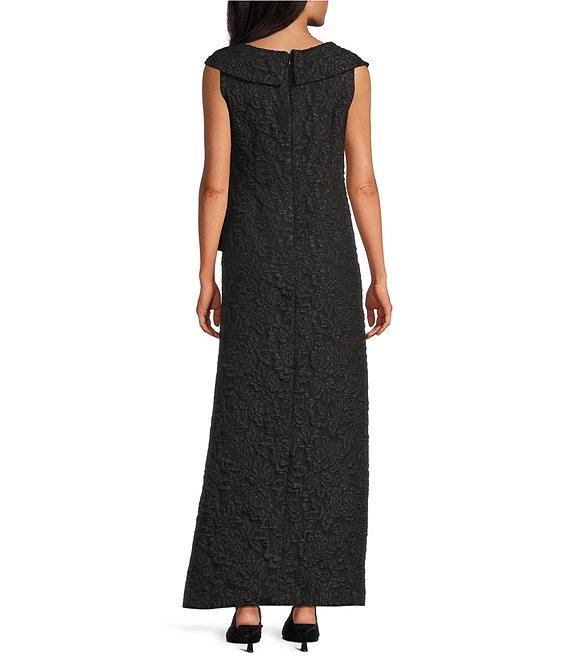 From Livia Jolie by Le Bos, this dress features: Cloque fabrication Sheath silhouette L-neckline Sleeveless Cascade side skirt Gathered Lined Center back zipper closure Center back hook and eye closure Approx. 56.5" in length from high point shoulder Polyester/spandex Hand wash cold/line dry Imported.