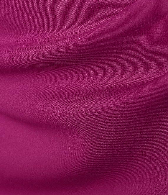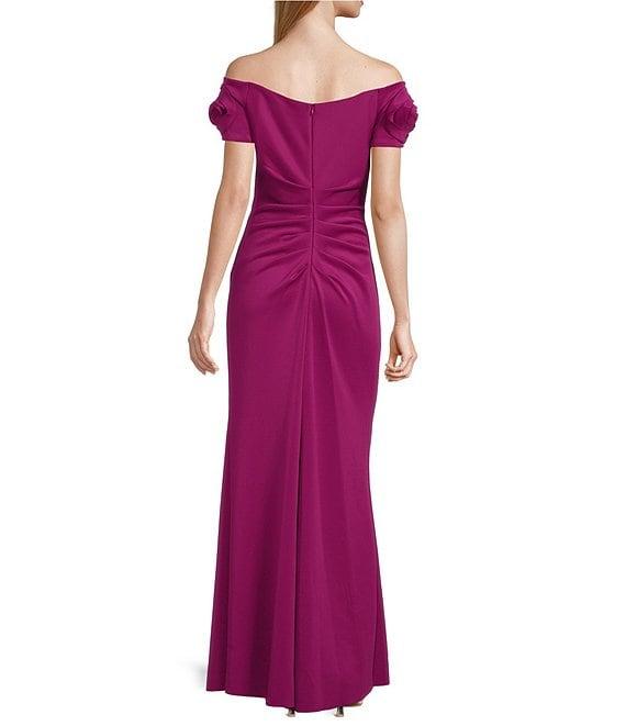 From Livia Jolie by Le Bos, this dress features: Scuba fabrication Round neckline Sleeveless Off the shoulder Rosette trim sleeves Gathered waist front bodice Center back zipper Approx. 60" from high point shoulder Polyester/spandex Hand wash cold/line dry Imported.