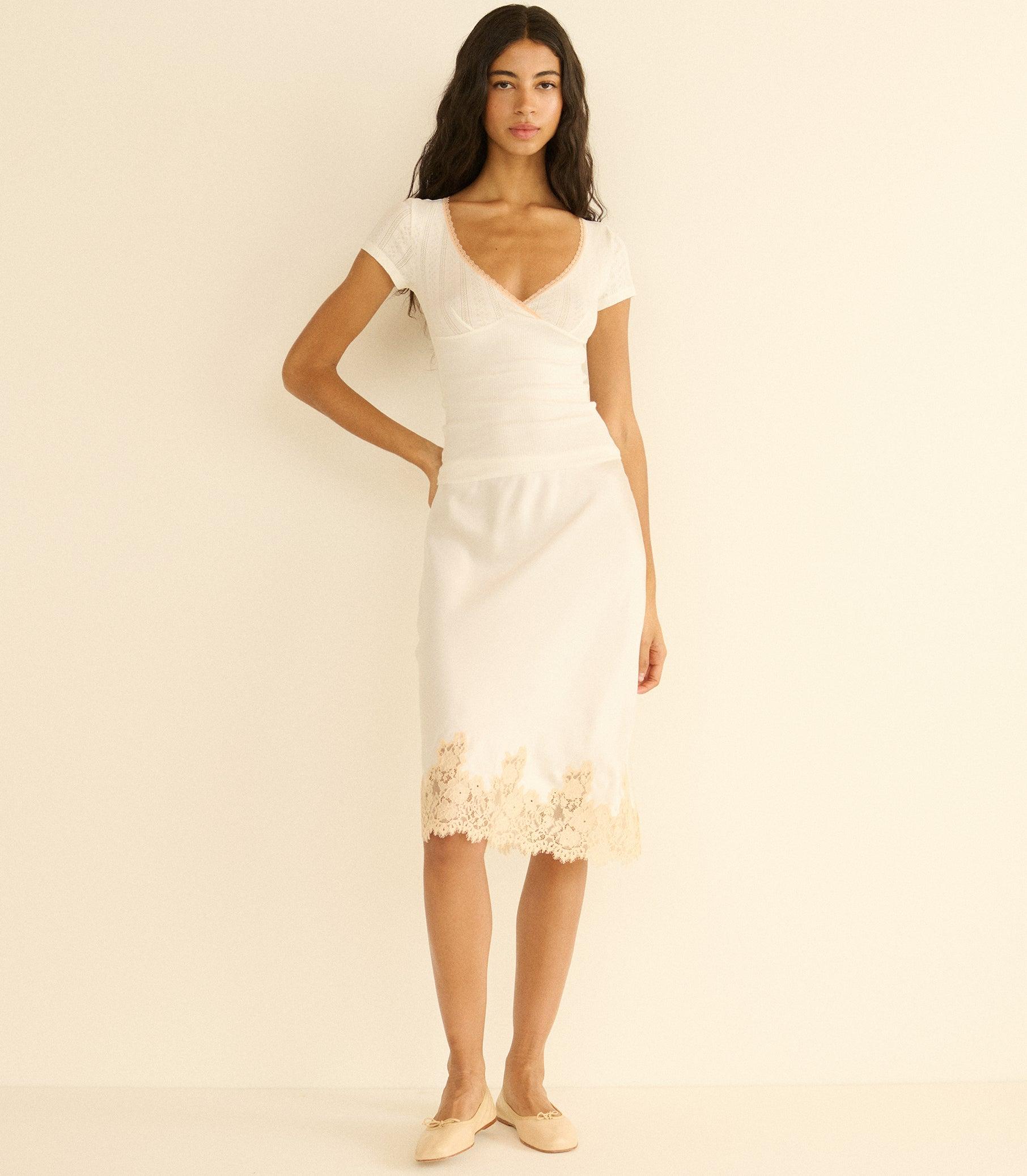 In the softest organic cotton, the Livia Tee features delicate pointelle at the bodice and sleeves, a close fit rib throughout the body, and a wrap V-neckline trimmed with delicate elastic lace.