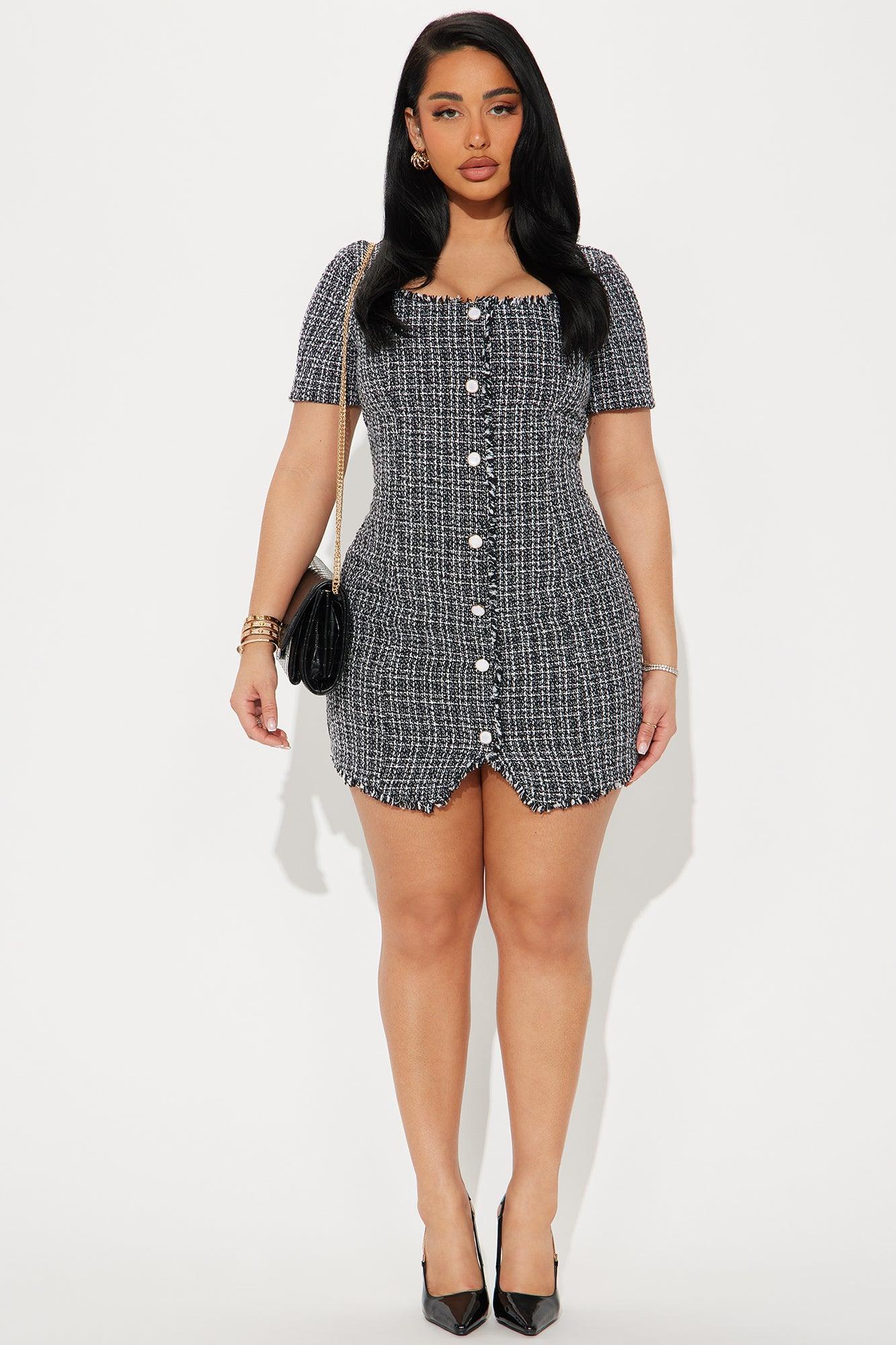 Available In Black/White. Tweed Micro Mini Dress Square neckline Short sleeves Faux Button up Back zipper Lined Length measured flat = 33" Self / Lining: 100% Polyester Imported California Proposition 65WARNING: Cancer and Reproductive Harm - www.P65Warnings.ca.gov.