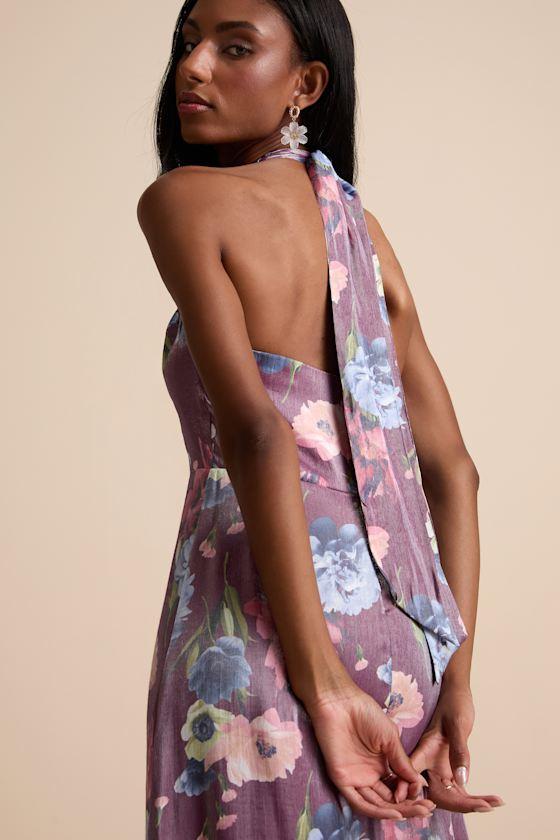 An outfit to remember, this sleek floral dress is the perfect pick for the summer soirees on your calendar. Brushed woven fabric lends a luminous sheen to the ankle-grazing maxi silhouette, falling from a tying halter neckline into a plunging bodice that's ready to be accentuated with your favorite jewelry. A thigh-high side slit creates effortless and flirty movement with every step. Hidden back zipper/clasp.