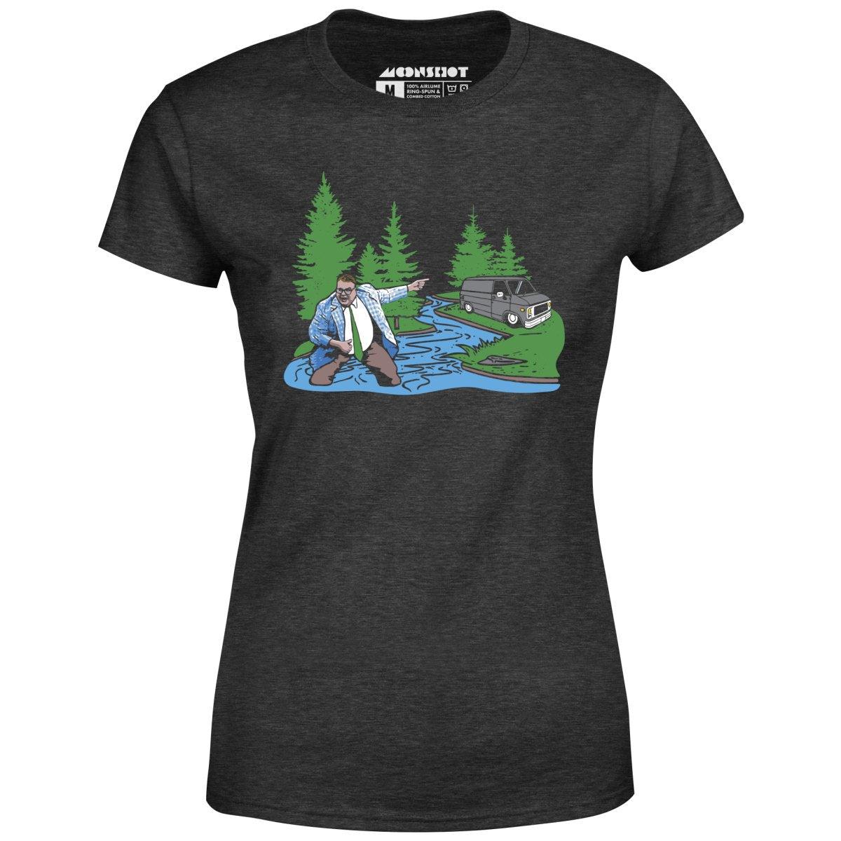 An epic parody concept illustration of Livin' in a Van Down by the River. Inspired by Matt Foley, motivational speaker. Printed on our super soft 100% ringspun & combed cotton women's T-Shirt. Or upgrade to our Luxury 52/48 cotton/poly vintage heather edition for an even softer classic look. We print & ship all of our high quality graphic tees in the USA.
