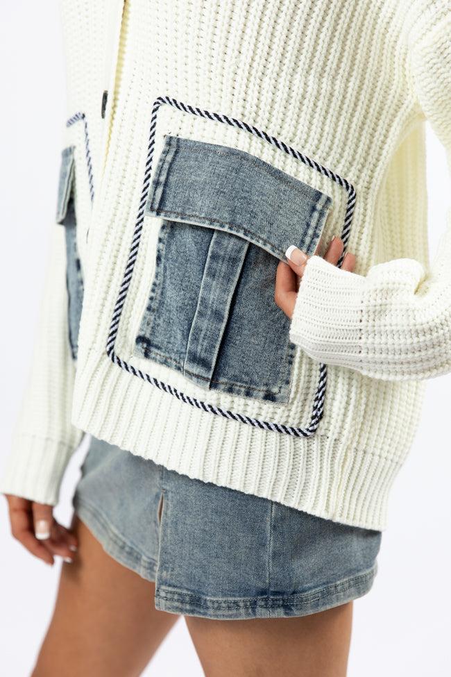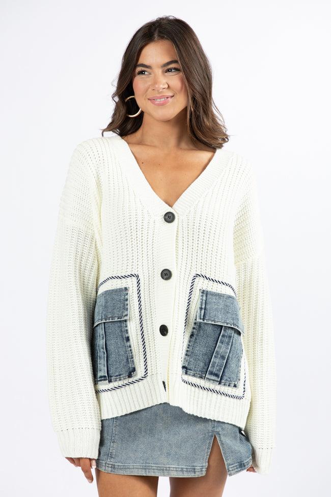 Details Ivory Denim Pocket Cardigan Fabric has stretch Denim functional pockets, ribbed hem, functional button up closure, knit pocket outline Pair this cardigan with a cute skort! Unlined Size small from shoulder to hem: 24.5" Material and Care Self: 100% acrylic Contrast: 100% cotton Machine wash cold, line dry Patterns may vary Materials may have natural variations Colors may vary from different viewing devices.