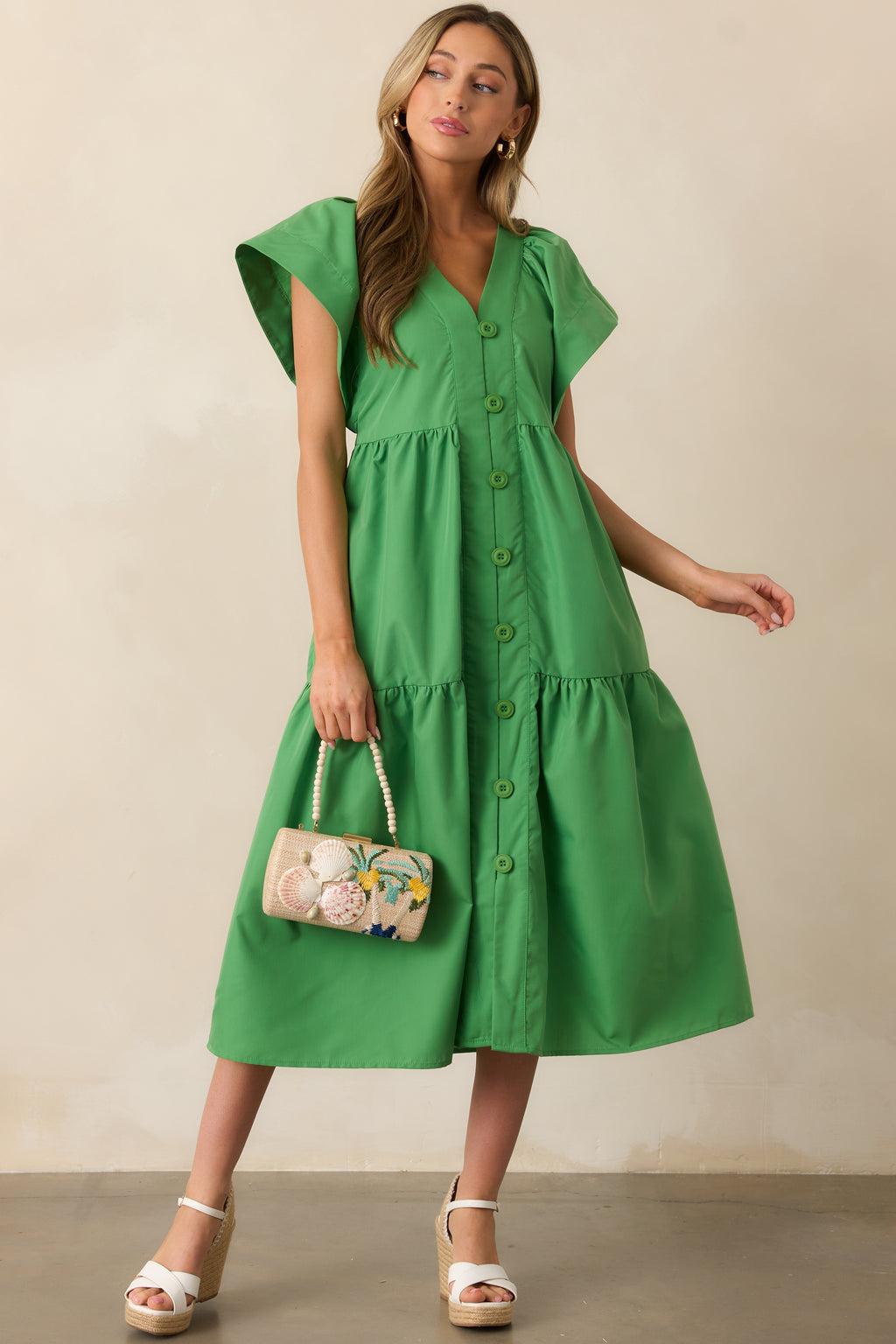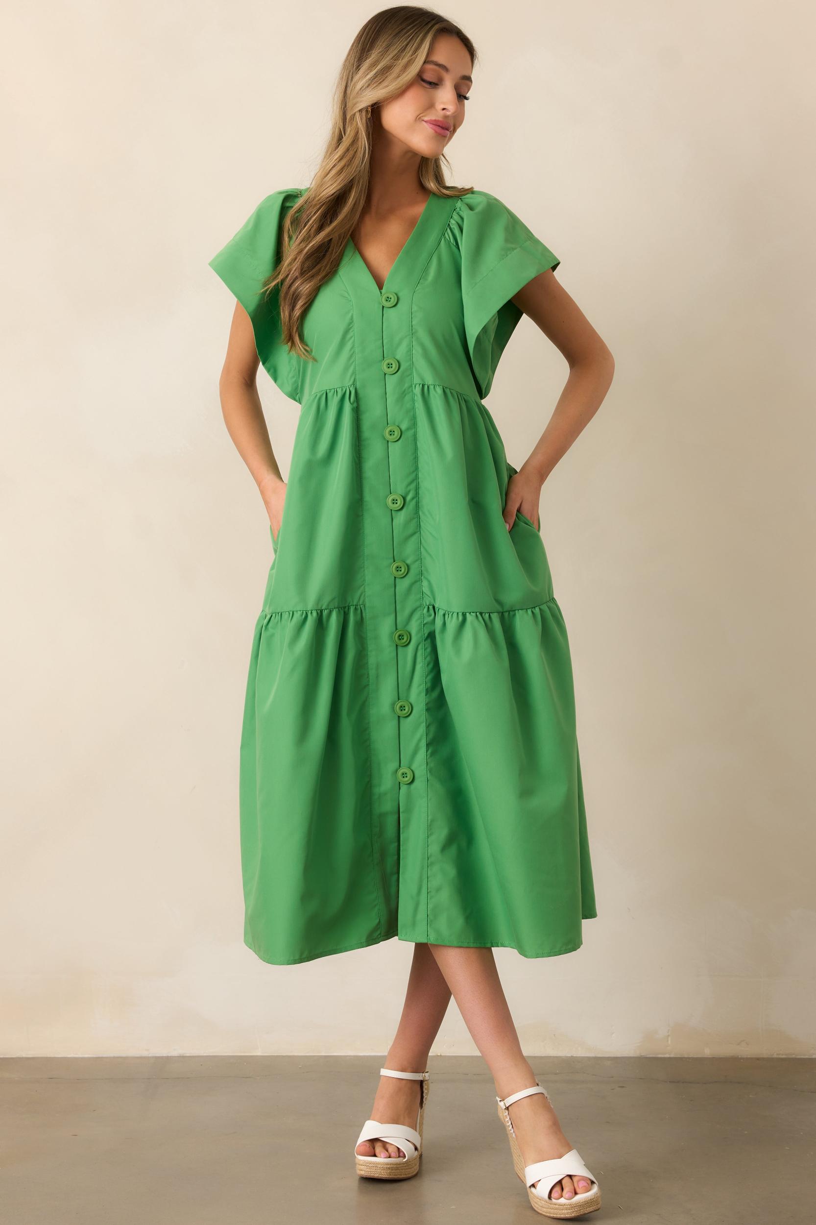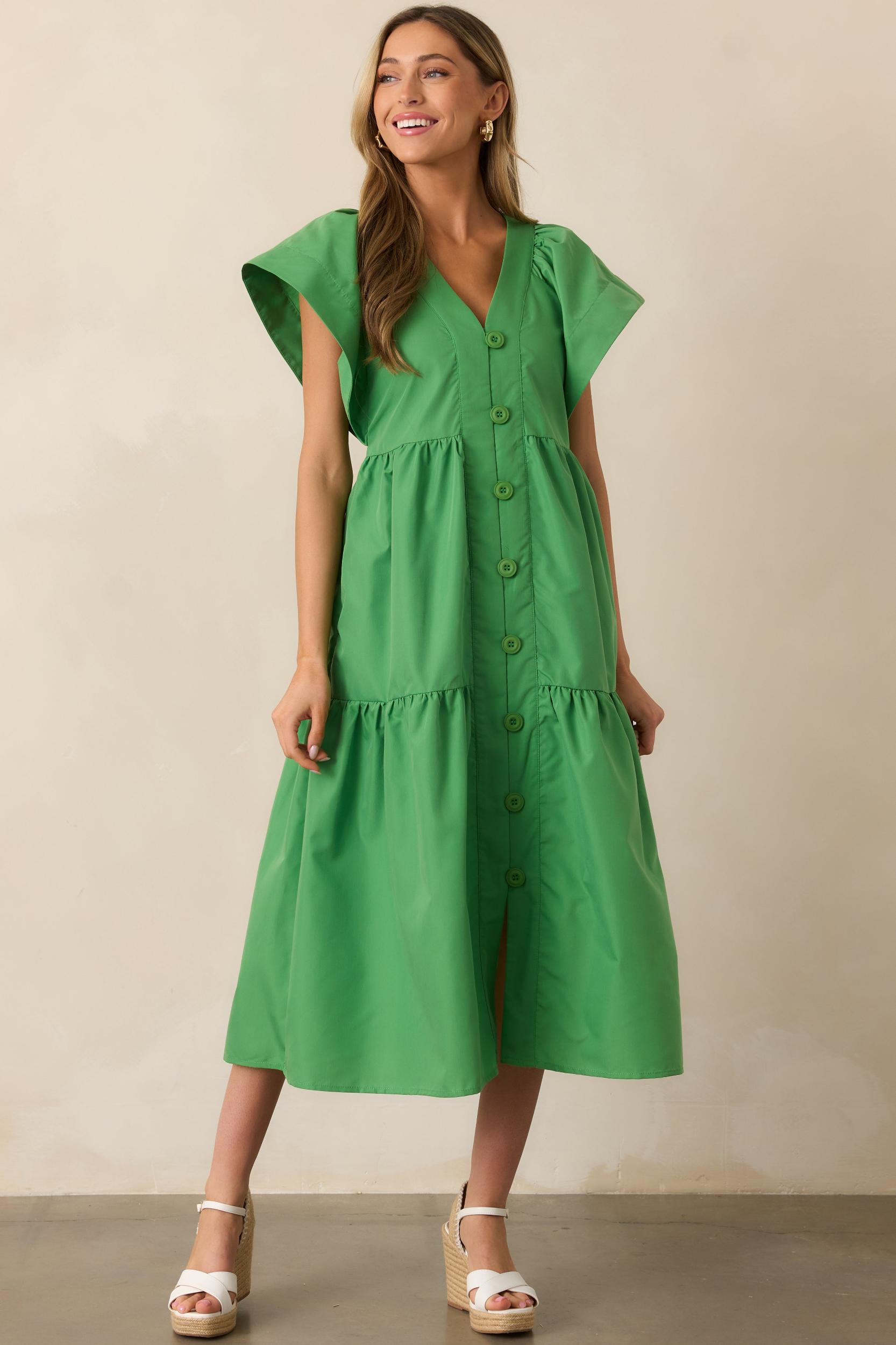 Looking for a versatile dress that can seamlessly transition from day to night? Look no further than the Vivid Palms Green Button Front Midi Dress. With its vibrant color, flattering midi-length, and easy button front design, this dress is both stylish and practical. Perfect for any occasion, this dress will quickly become a staple in your wardrobe. This green midi dress features a v-neckline, button front design, tiered design, and short flutter sleeves.