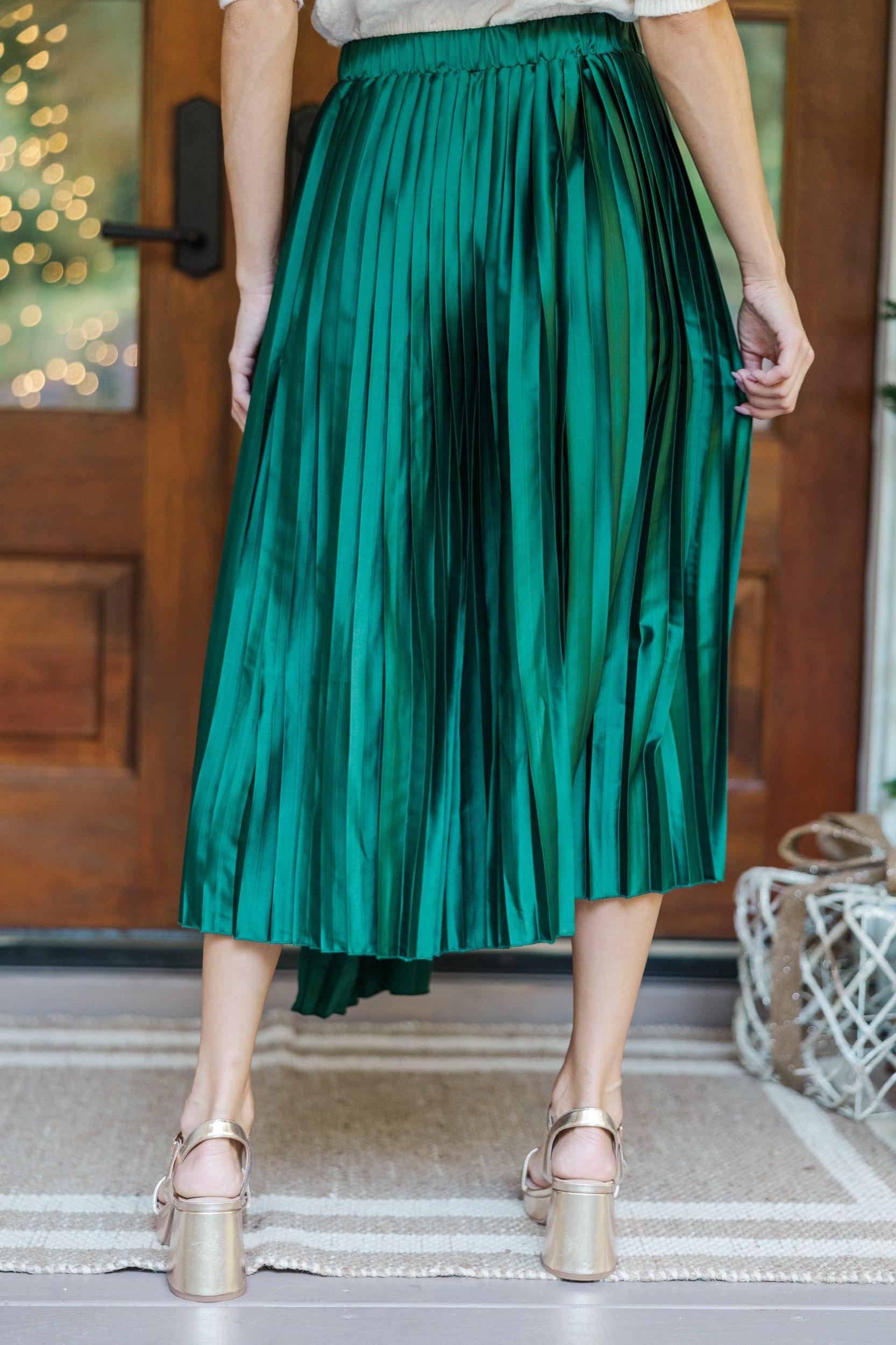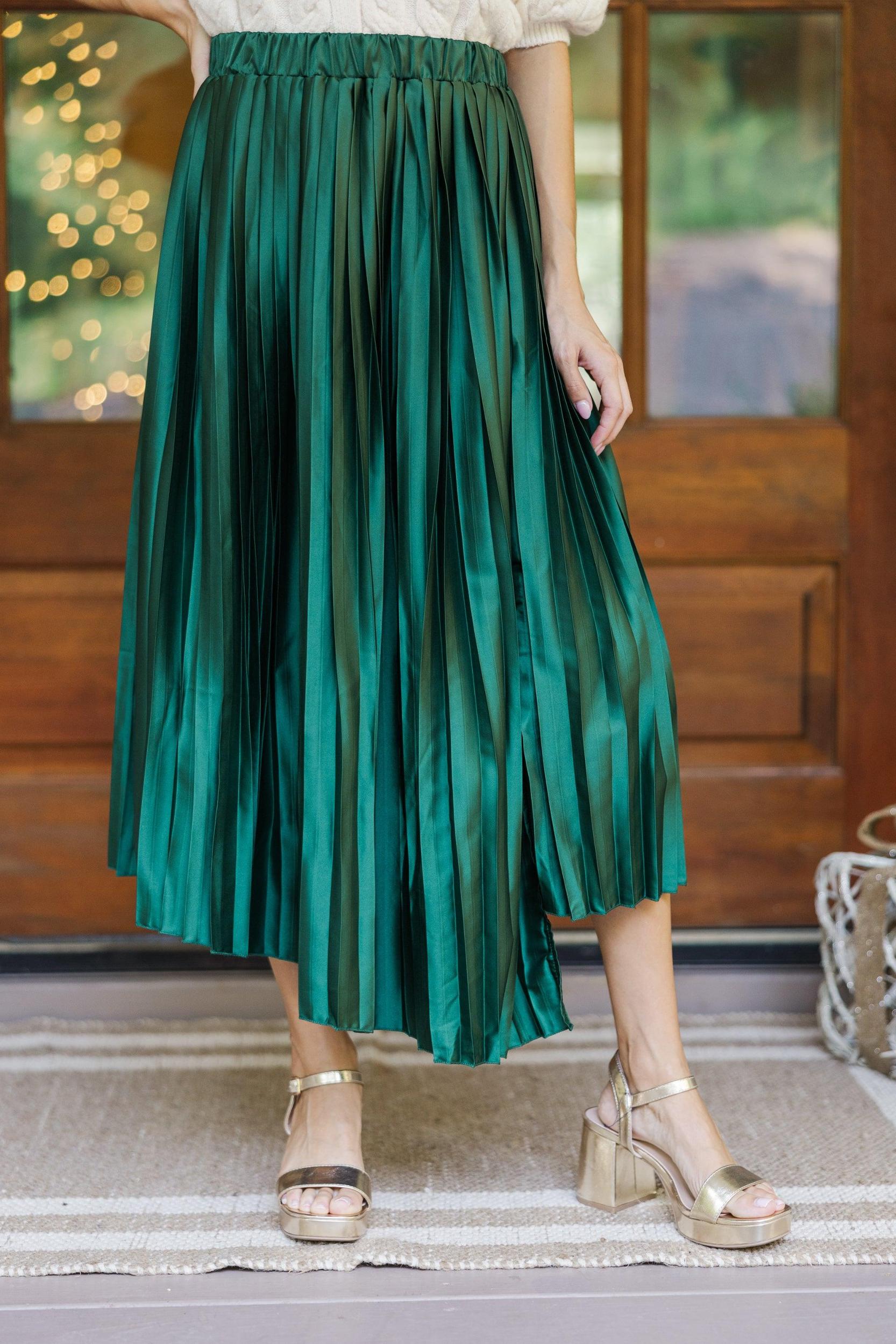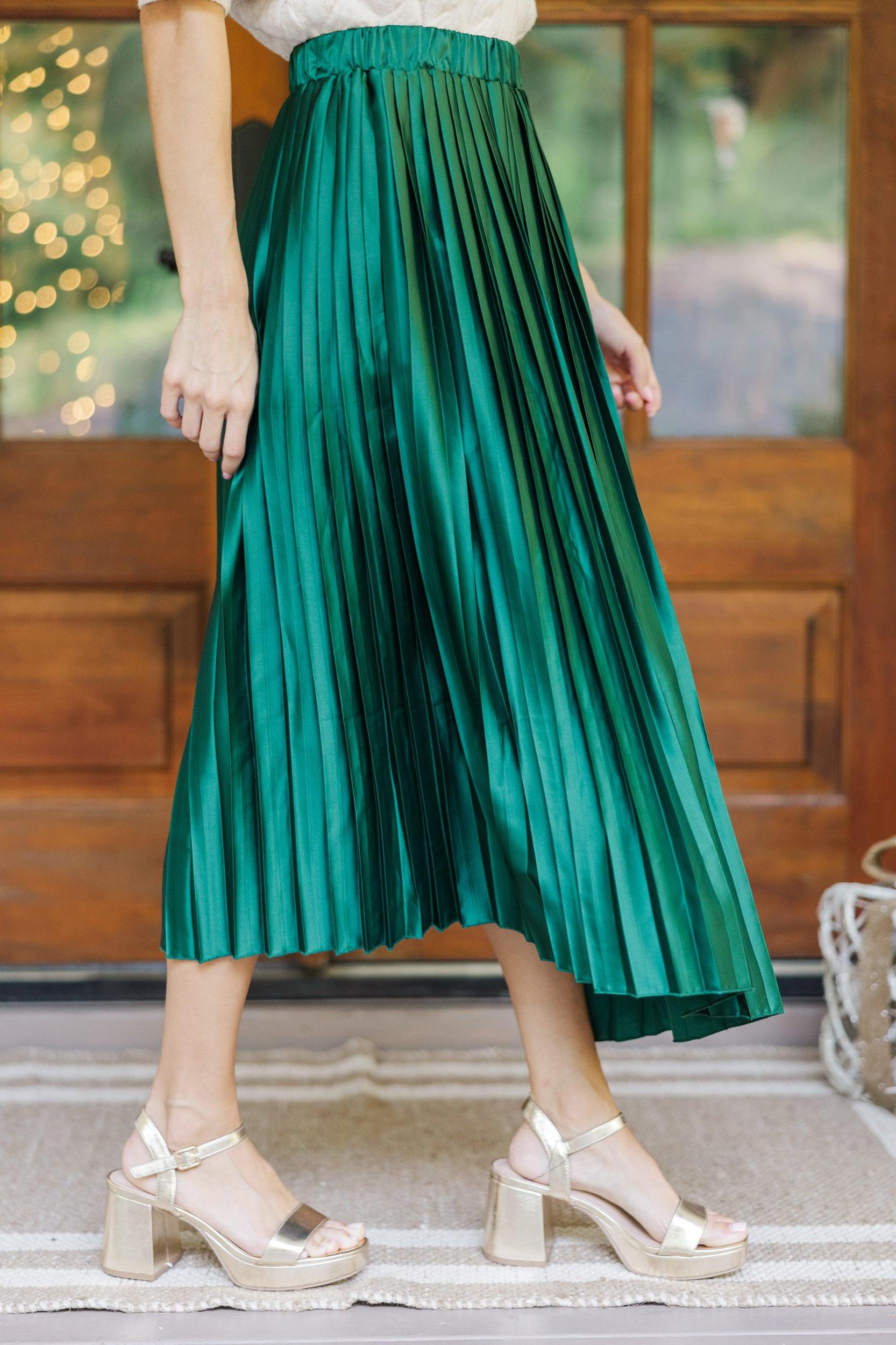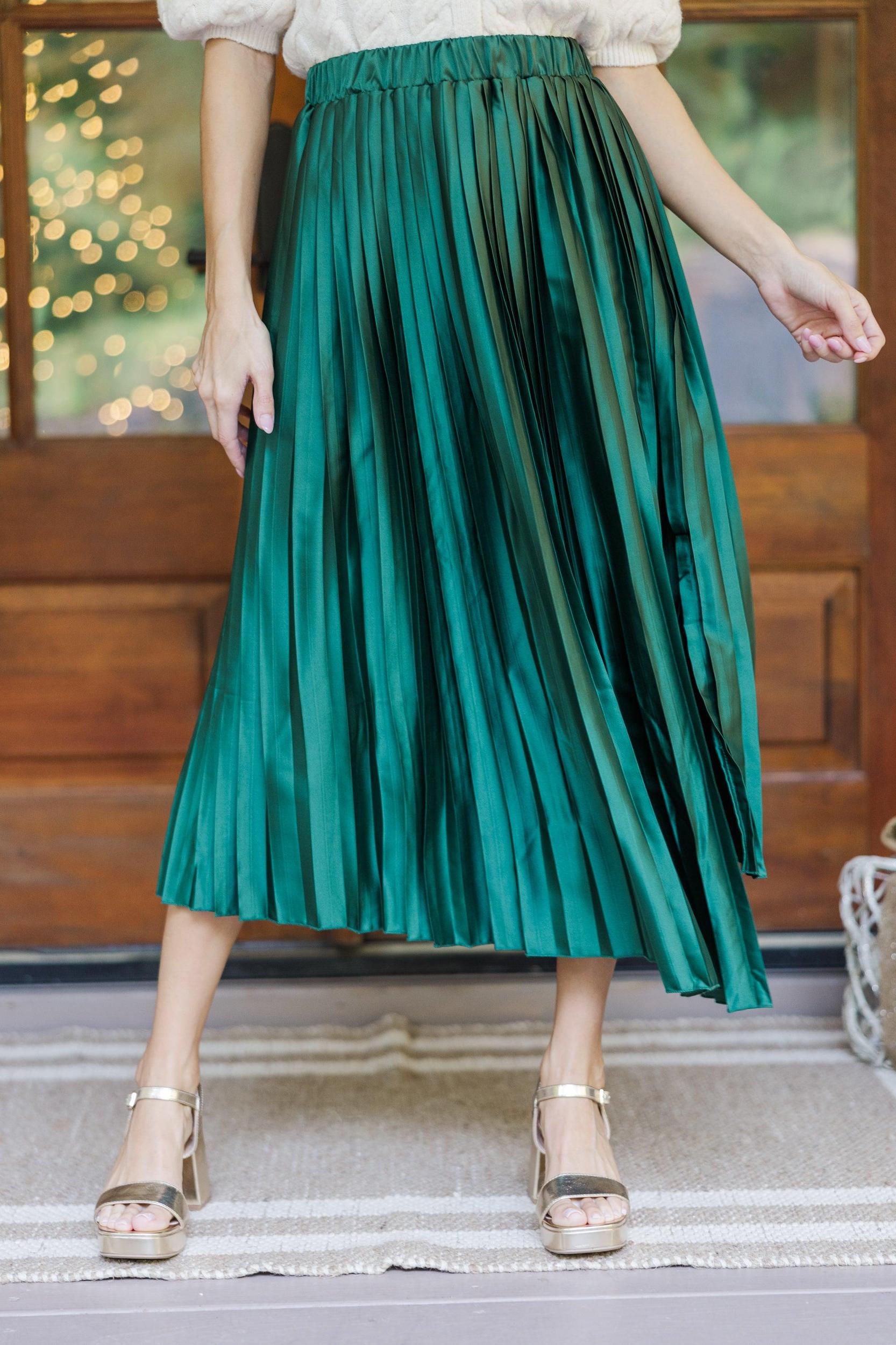 This satin midi skirt is stunning! That pleated fabric gives this skirt such a flowy fit! Plus, we all love a comfy, elastic waist! This midi skirt is going to look fabulous with cozy sweaters. Elastic waist Satin pleated fabric No stretch Baileigh is wearing the small.