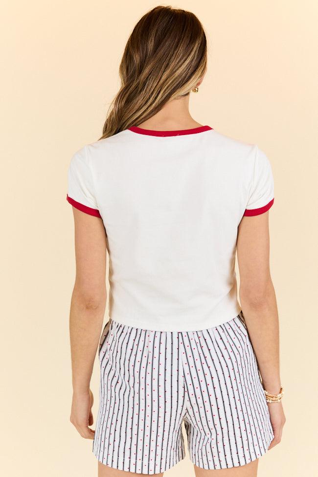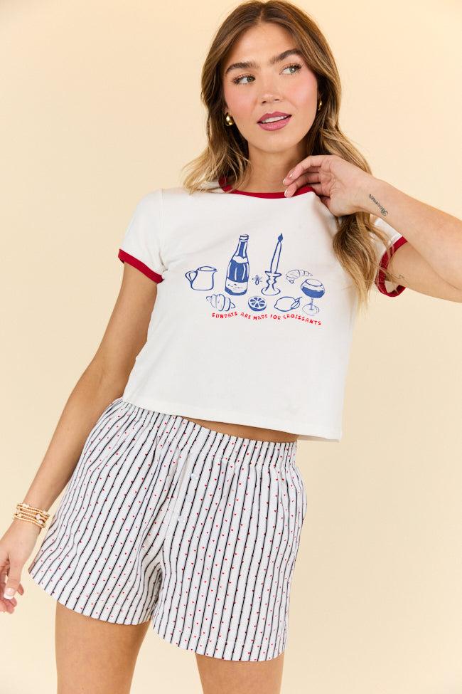 Details White Graphic Cropped Tee Fabric has stretch Crew neckline, short sleeves, dinner graphic Unlined Size small from shoulder to hem: 15.5" Material and Care 92% cotton 8% spandex Hand wash cold, line dry Patterns may vary Materials may have natural variations Colors may vary from different viewing devices.
