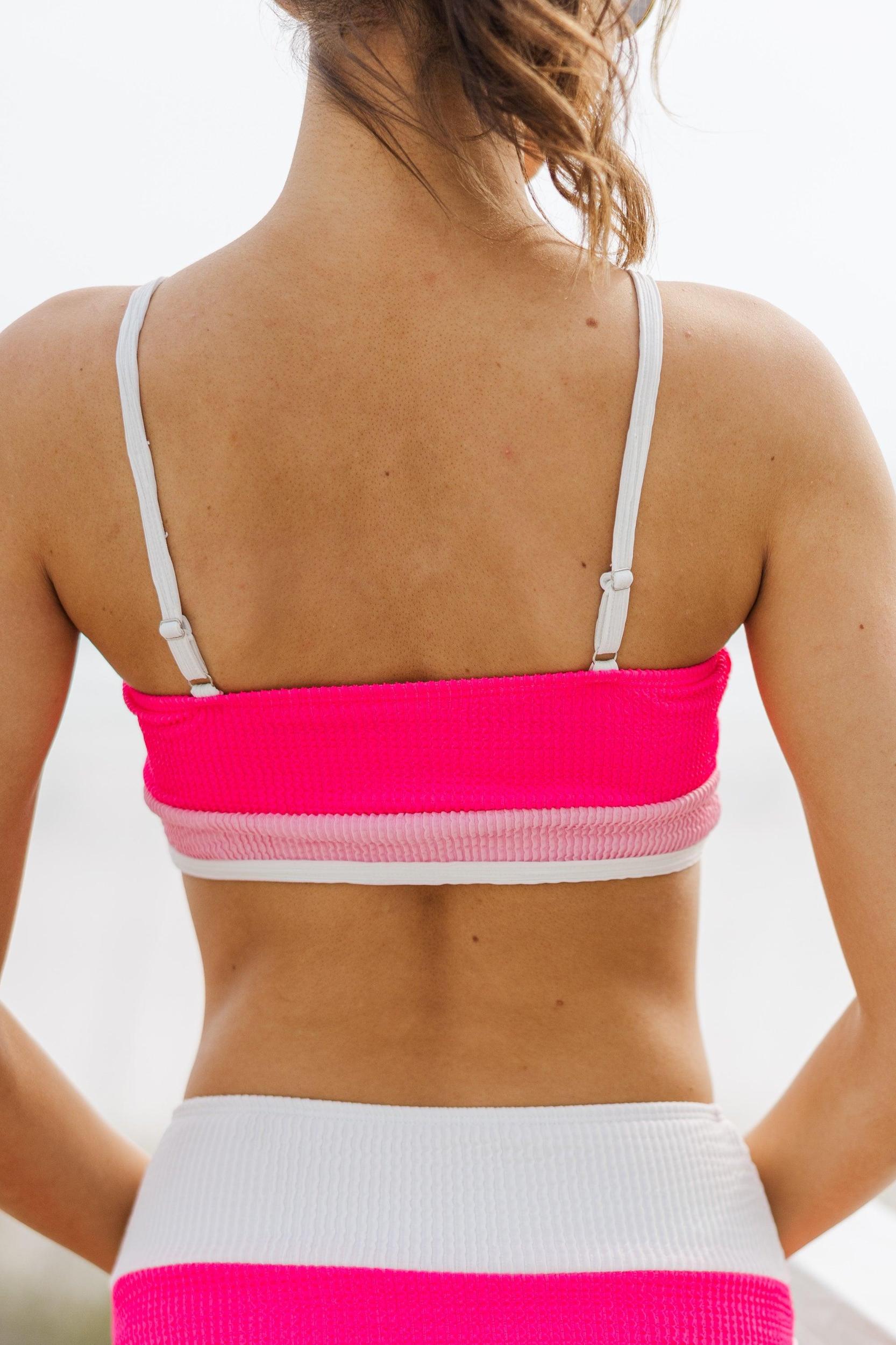 You are going to be living the life in this vibrant bikini top! Those hues are all so fun together! The fit is also super sporty and classic. The textured/ribbed fabric is really cute too! Scoop neckline Adjustable spaghetti straps Removable padding Textured fabric Colorblock print Generous stretch Savannah is wearing the small.