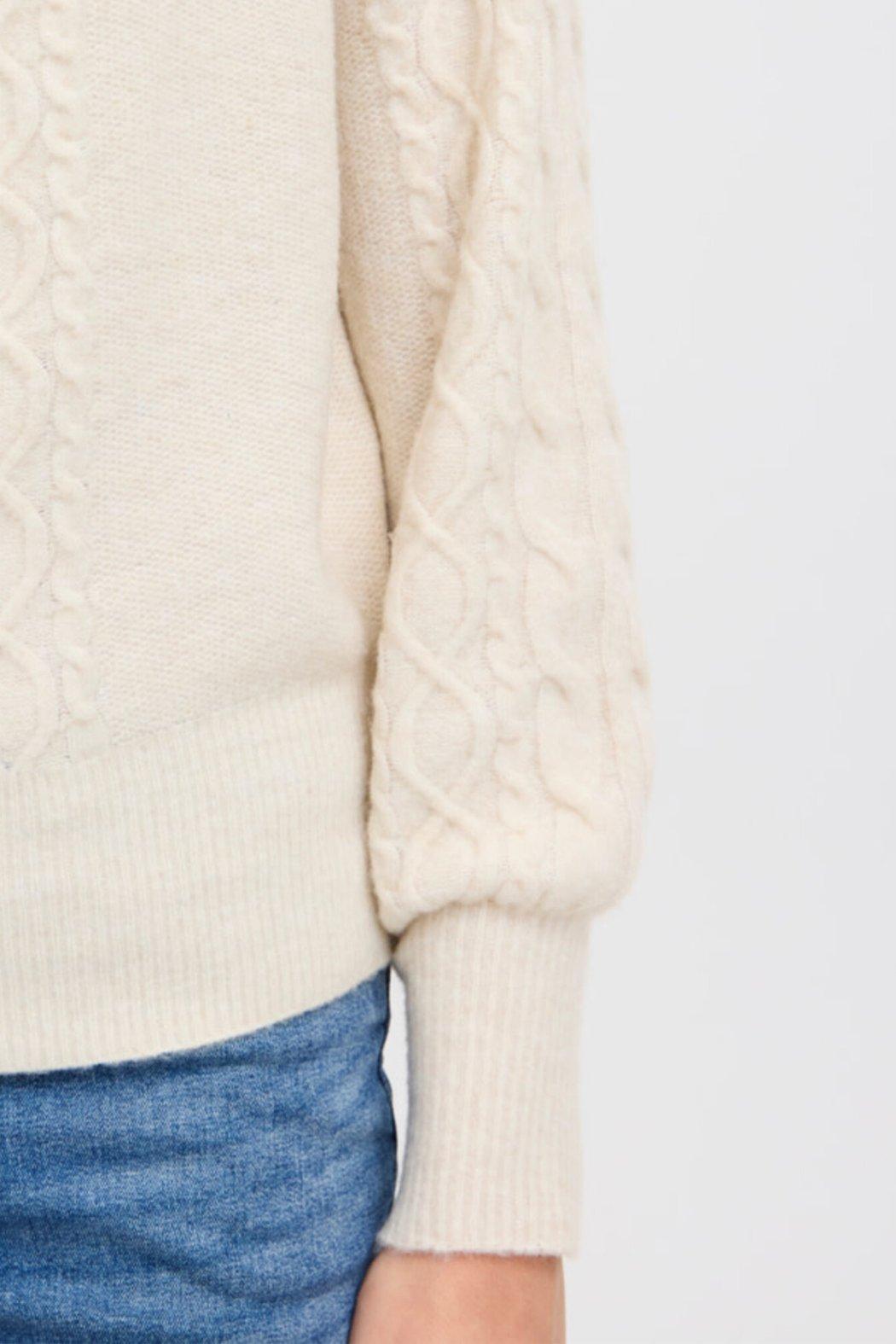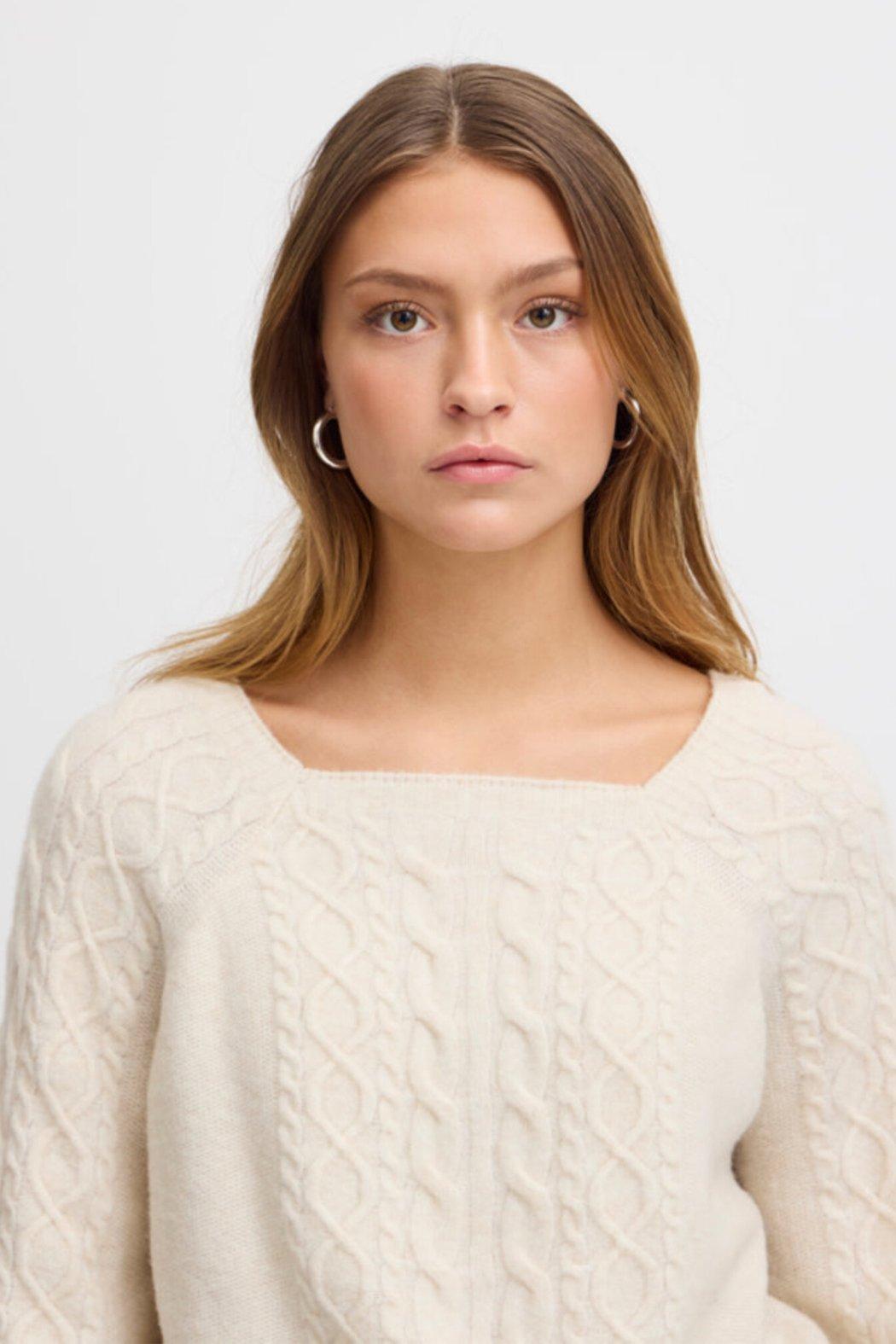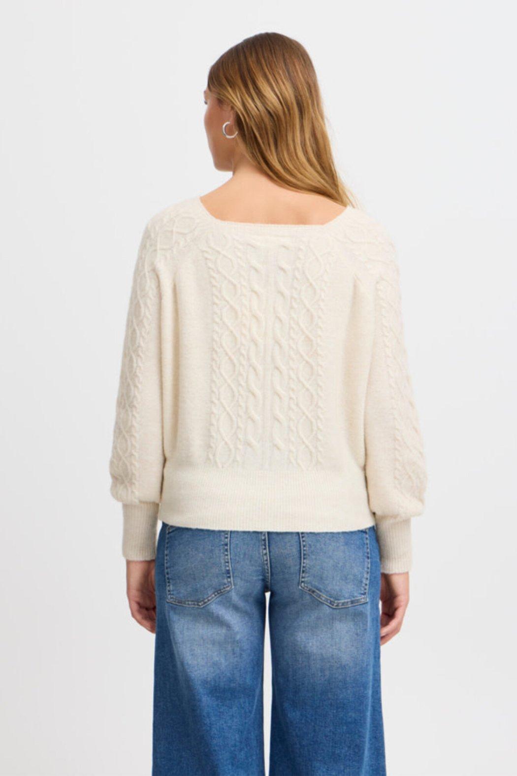 This cream cable knit sweater features a flattering square neckline and ribbed hem and cuffs. Wear it on its own with jeans for a timeless casual look or layer with a turtleneck or button up underneath for an elevated look.