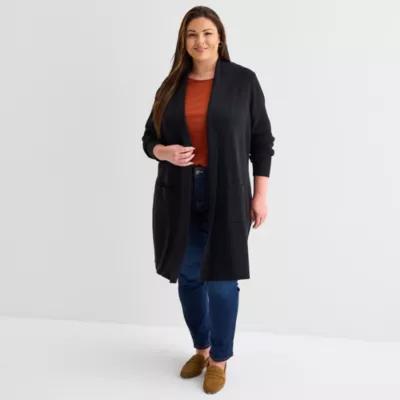 Liz Claiborne Womens Long Sleeve Open Front Plus Plaid Cardigan