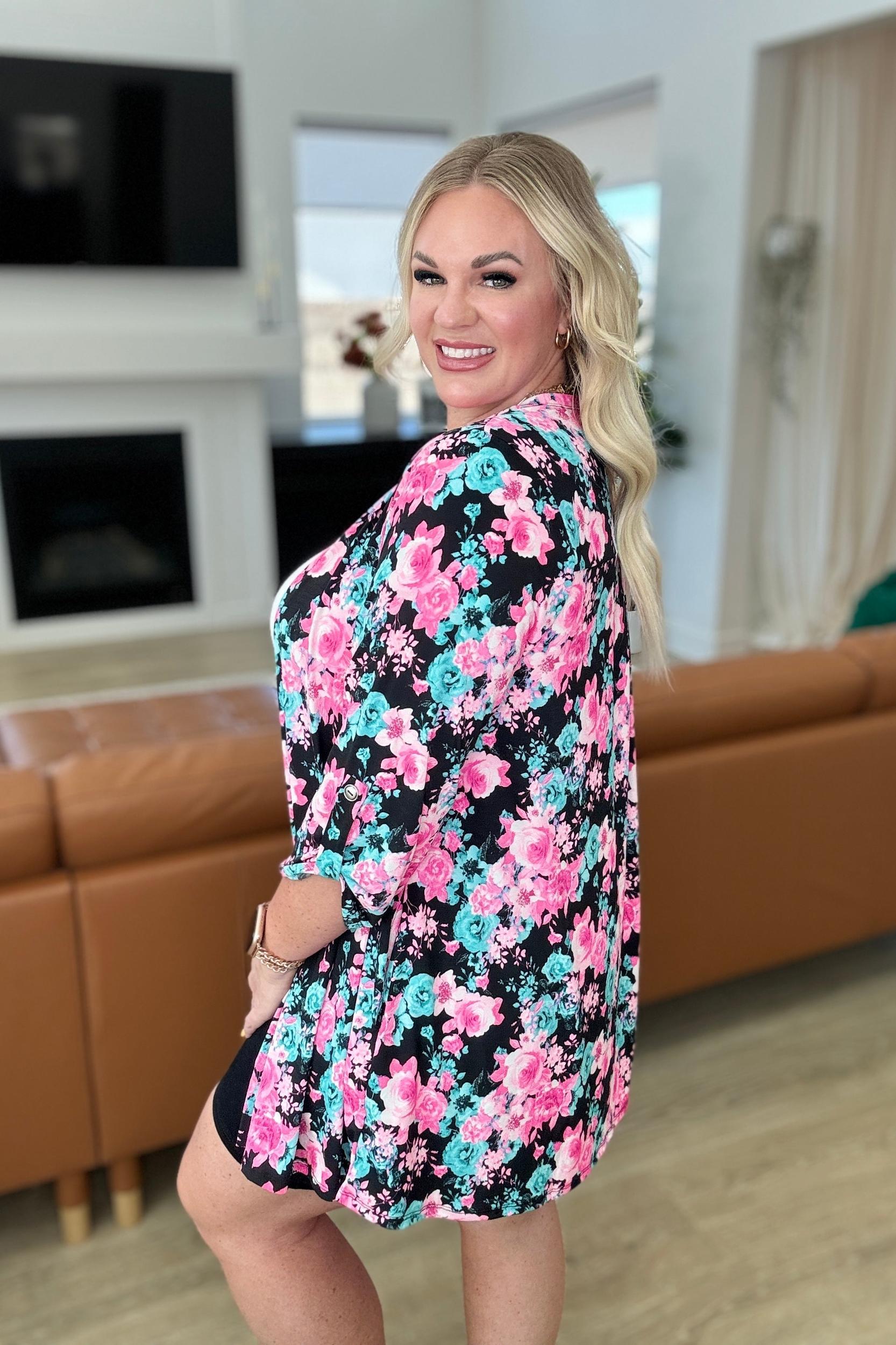 Introducing the Lizzy Cardigan in Black and Pink Floral, the perfect blend of style and comfort. Stay cool with the Bulagri fabric and enjoy the wrinkle-resistant and lightweight properties. Featuring faux button tabs on 3/4 sleeves, an open front, and a pleated back for a unique look. With functional pockets and a comfortable fit, this cardigan is a must-have. Order now for a fresh and playful look (and cozy comfort)!