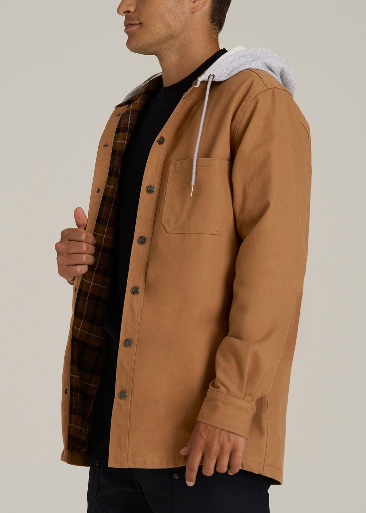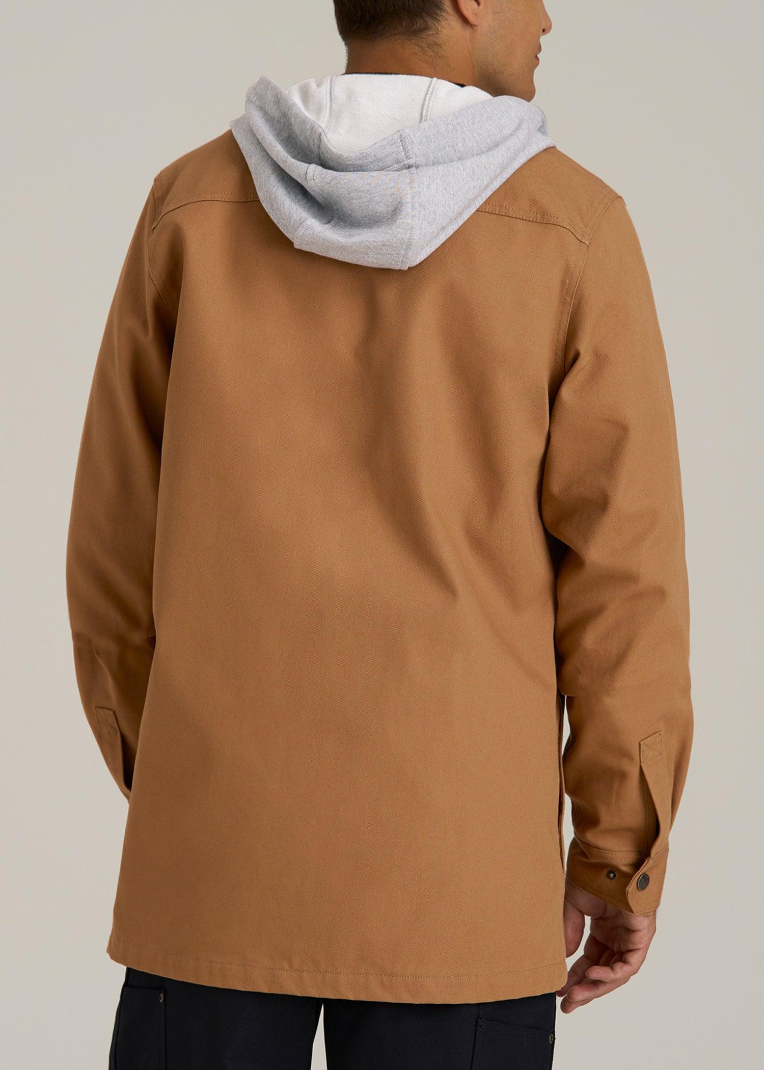 Shacket Season, Sorted The Durable Tall Men’s Shirt Jacket Part of our A.T. Adventure line, this flannel-lined canvas men's tall shacket layers like a shirt while warming like a coat. Throw it on for dawn hikes or patio beers — either way, this fit is built for you.• Double chest pockets + stealth interior slot• Hand-warmer welt pockets• Relaxed, hip-length cut won’t ride up SIZE & FIT: Roomy shoulders; long sleeves True tall torso length Button cuffs roll and stay put Model is 6'5" wearing size M Tall Size M Tall: Body length: 34", Sleeve length: 39" FABRIC & CARE: Shell: 100% cotton canvas Flannel Lining: 100% cotton Machine wash cold with like colors Do not bleach Tumble dry low Low heat iron